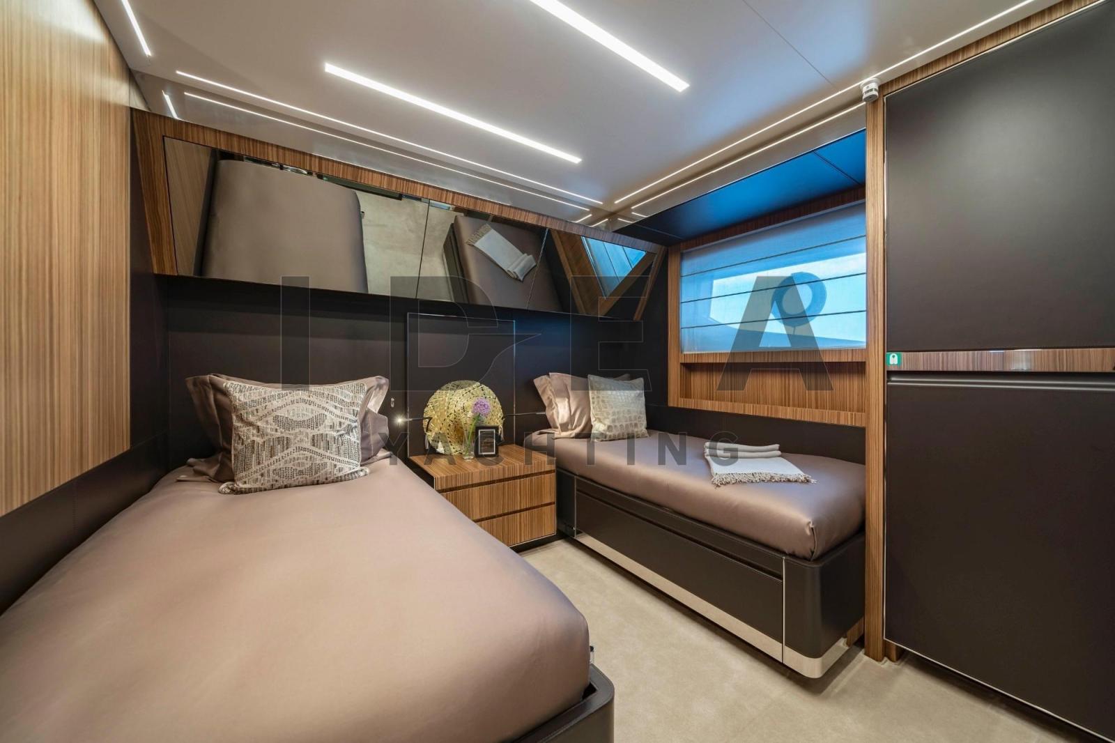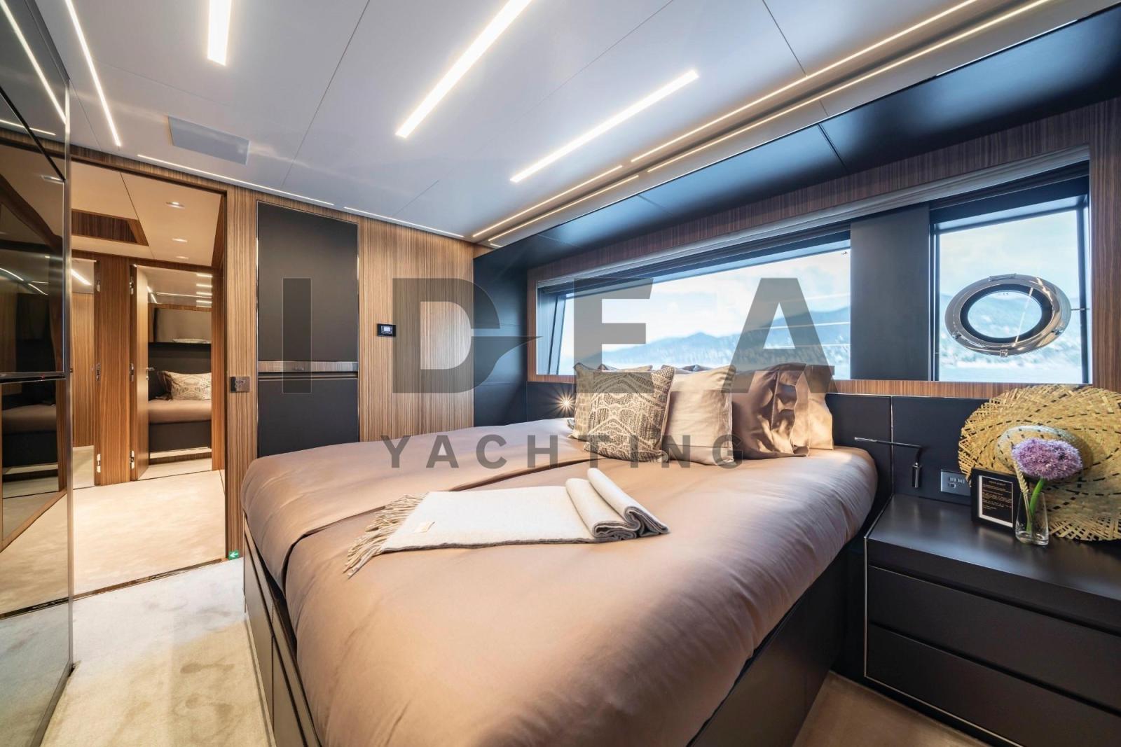 Sellerie complète, Coussins arrieres, Coussin avant, Sellerie de fly, sellerie de cockpit, Taud de soleil (in the flybridge and in the bow).