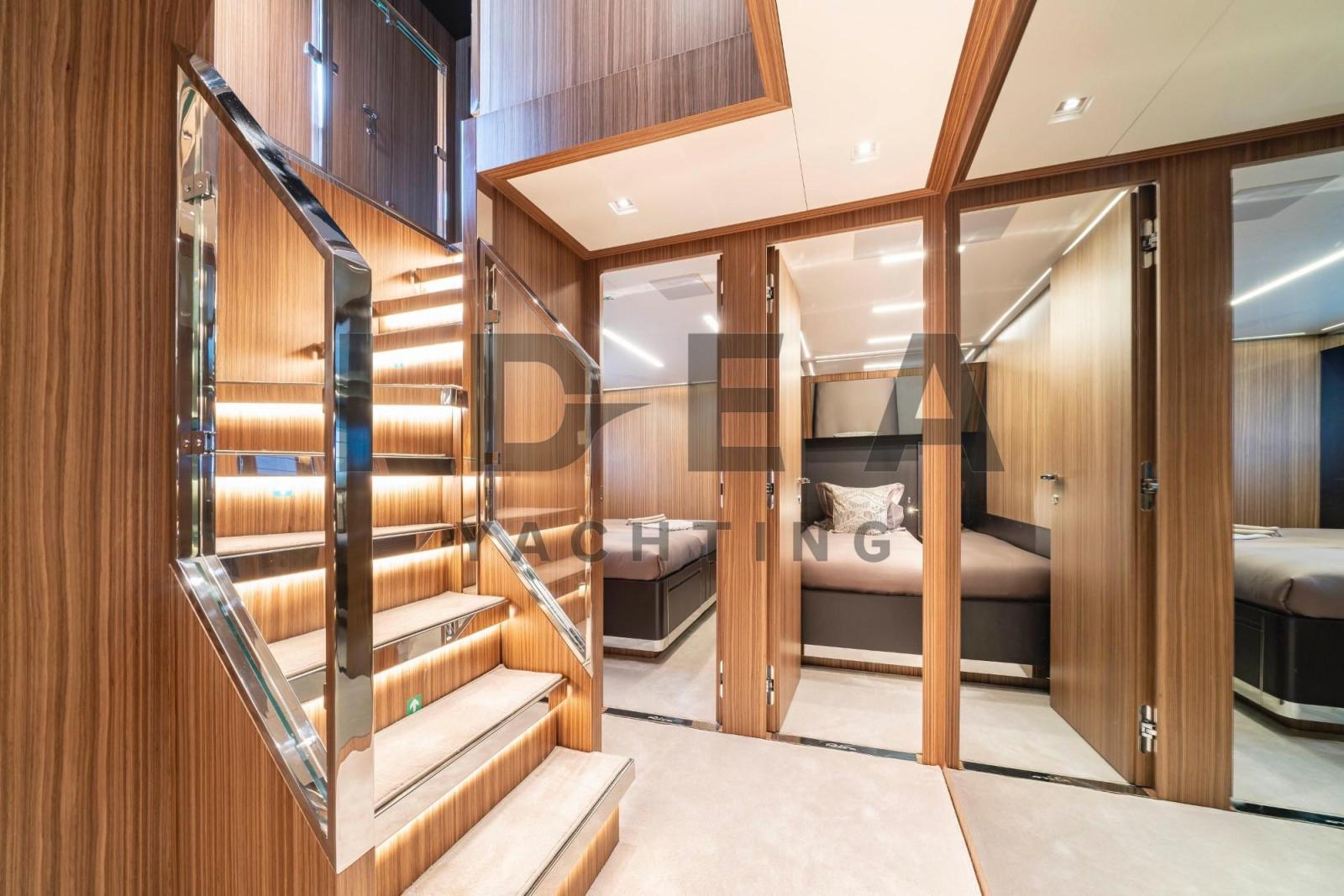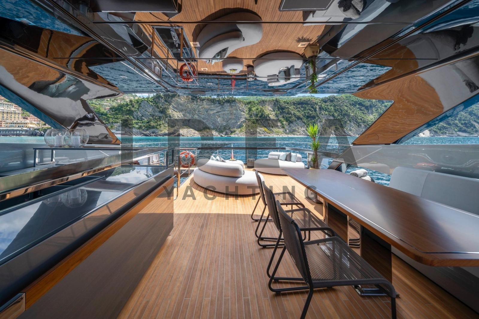 Il est difficile d’ignorer l’héritage du design du Riva Corsaro. Riva a travaillé en étroite collaboration avec Officina Italiana Design, le studio fondé par Mauro Micheli et Sergio Beretta, qui a conçu les incarnations modernes des célèbres dayboats Rivare, notamment l’Aquariva 33, le Rivarama 44 et le Domino 86. Il n’est pas surprenant que l’ADN d’élégance et de luxe de la marque Riva soit évident dans le Corsaro, qui avance dans le sillage de ses illustres ancêtres, avec une fusion ingénieuse de confort et de performance, de technologie et de design, de sécurité et de style. M/Y GOLD BLACK coche toutes les cases, avec des lignes extérieures dynamiques et sa coque argentée caractéristique, et c’est un chavirage garanti où qu’il se produise. Il peut accueillir jusqu’à 10 personnes dans 5 cabines, avec des vues panoramiques distinctives depuis son intérieur qui sont également appréciées, presque au niveau de la mer, par 2 de ses cabines d’invités. Pour un maximum de sécurité et de confort, entièrement équipé il dispose de 2 stabilisateurs Seakeeper qui fonctionnent en cours et au mouillage. Pour vous divertir, vous pouvez trouver les derniers systèmes audiovisuels et ses nombreux espaces extérieurs comprennent des bars, des repas en plein air, des chaises longues, des sièges et de l’ombre. Il est propulsé par des moteurs principaux MTU 16V 2000 M96L, qui augmentent sa puissance de 203 ch par moteur à 2638 ch par moteur.