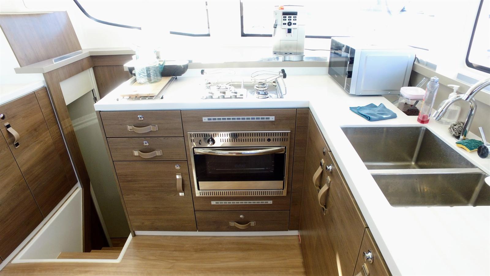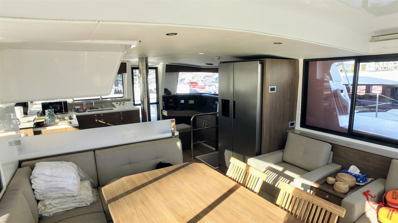 Air conditionné (reservible pour 4 cabines), BBQ/ Grill (Type plancha gaz), Ballon d'eau chaude, Dessalinisateur (240l/h en 220 vlt), Convertisseur (12/220 2000VA), 5 Prises interieures 12v, Prises interieures 220v, 2 Réservoir d'eau noire, 4 Toilettes électriques, Toilettes manuelles.