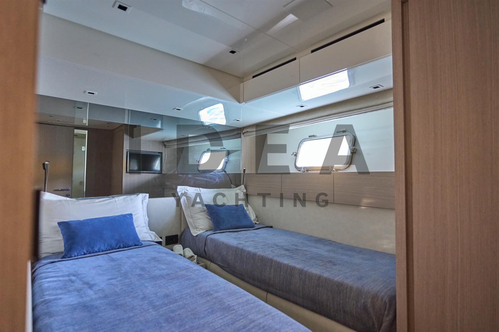 Sellerie complète, Coussins arrieres, Coussin avant, Sellerie de fly, sellerie de cockpit, Rideaux occultants (Master Cabin), Taud de soleil (at bow with inox poles, in the stern side on fly).