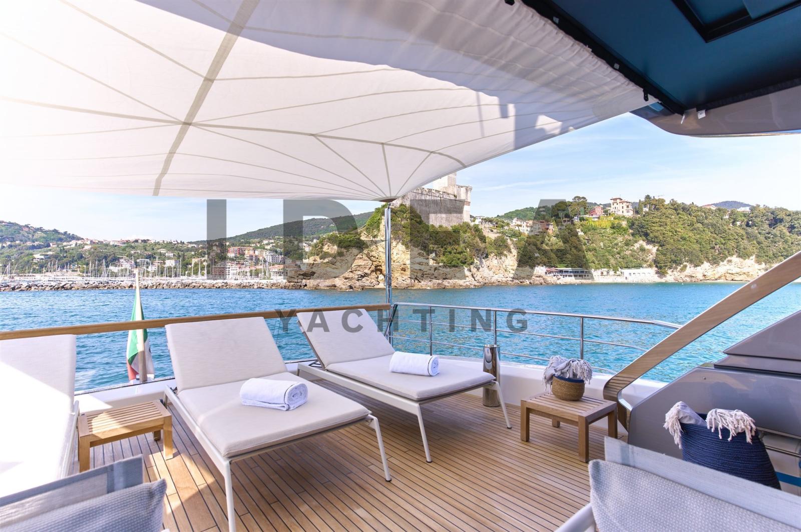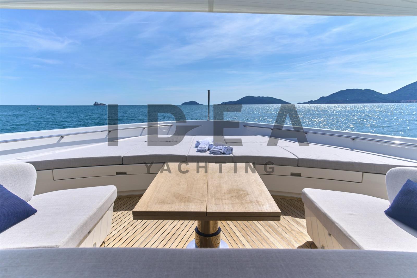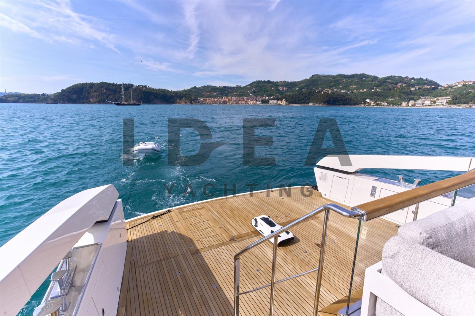 Eau sous pression, Passavant en teck, Chargeur de batterie (12V 25A for gen set), Douche de cockpit (on fly), Double barre à roue, Phare de poursuite (with helm station control), Hard top (with opening roof system), 4 Spots sous-marins (LED 7000 lumen,2 at stern, 1 at port side and 1 starboard side), Plateforme arrière (hydraulic at stern), Porte latérale, Cockpit en teck (and Teak on fly bridge), Prise de quai, Connexion eau sous pression à quai, Répétiteur électronique, Echelle de bain, Selles pour Annexe, Stabilisateurs (CMC Marine Fins Zero Speed (at anchor and during navigation)), table de cockpit (Up/down electric with manual folding top in varnished teak tio), Annexe (Williams Sportjet 395).