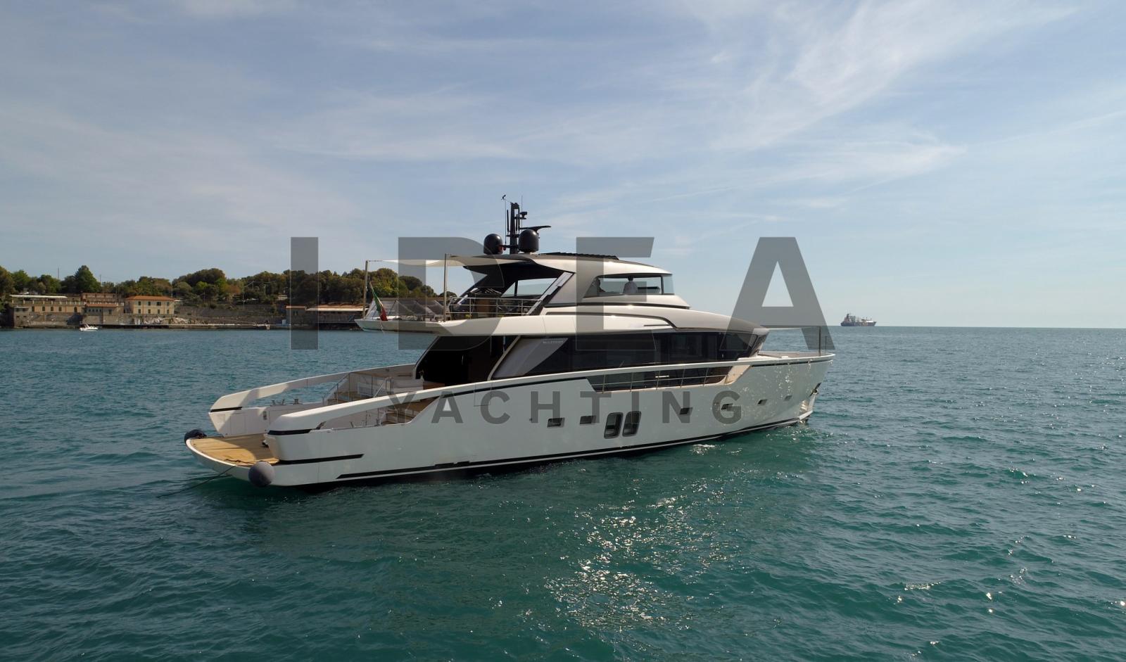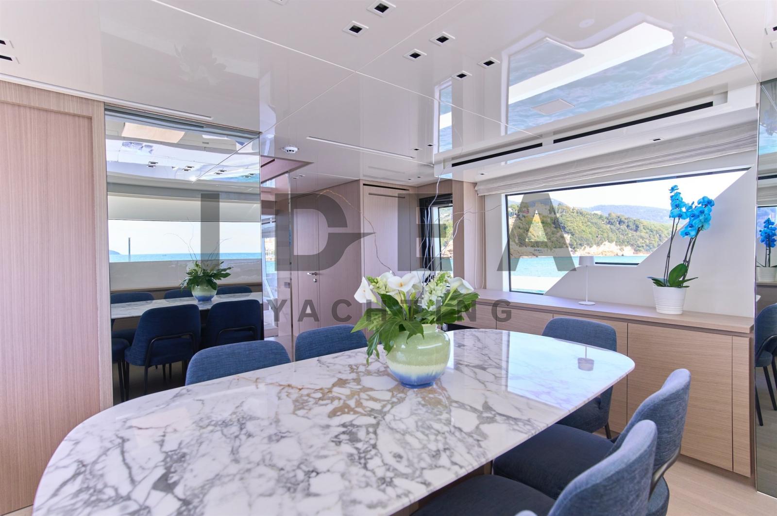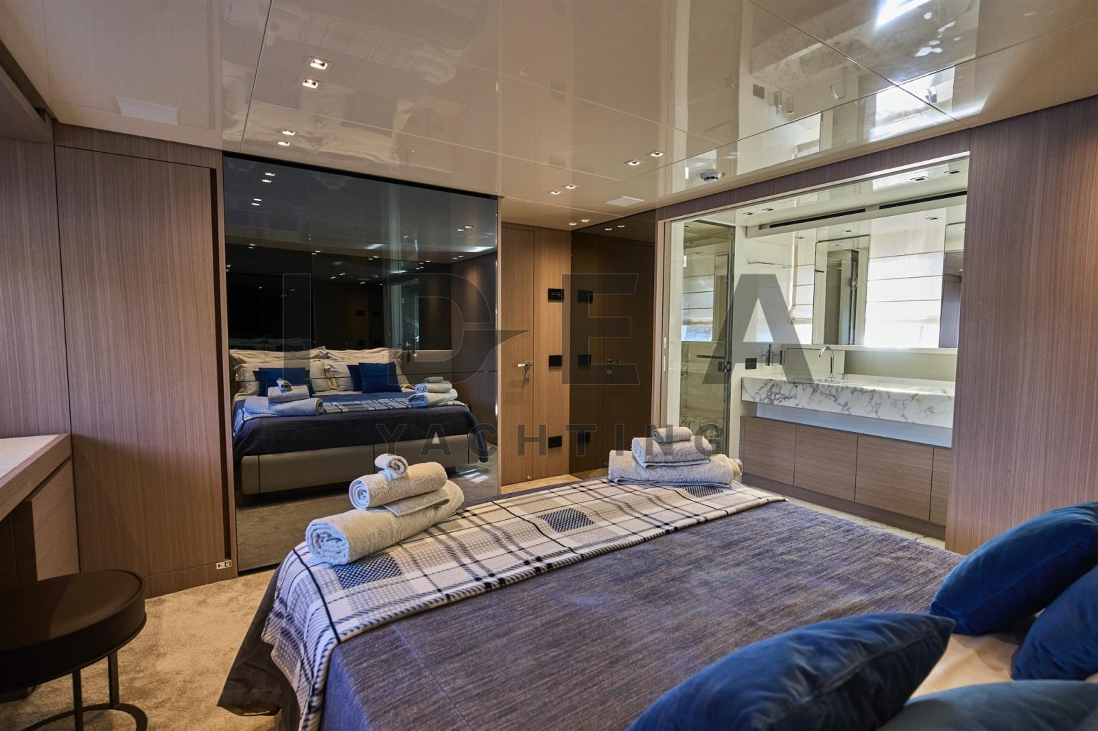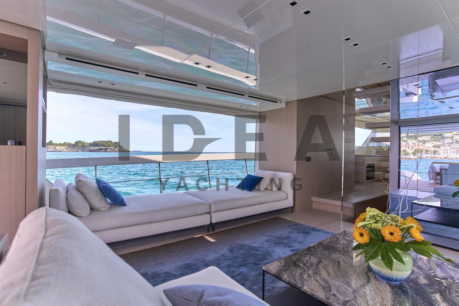 En observant la superstructure qui s’étend vers l’avant et la plage avec les proportions d’une grande terrasse, il devient immédiatement clair que la ligne SX est un projet révolutionnaire. Les fonctions et les utilisations des espaces s’entremêlent, donnant naissance à un yacht « crossover » parfait pour les propriétaires contemporains sophistiqués. Le pont principal a été libéré de la timonerie, qui est placée sur le pont volant: le résultat est un espace continu à utiliser comme un grand espace de vie unifié. Le pont supérieur, qui accueille la timonerie, a une double fonction: protégé vers la proue par un pare-brise fixe, grâce à un système de panneaux coulissants, il peut devenir un salon panoramique fermé et climatisé; Maintenu ouvert sur les trois côtés vers la poupe, il assure un contact direct avec la mer. Son aménagement intérieur de quatre cabines offre un hébergement spacieux pouvant accueillir jusqu’à huit personnes sur son pont inférieur divisé en une suite principale, une suite VIP avant et deux cabines doubles.