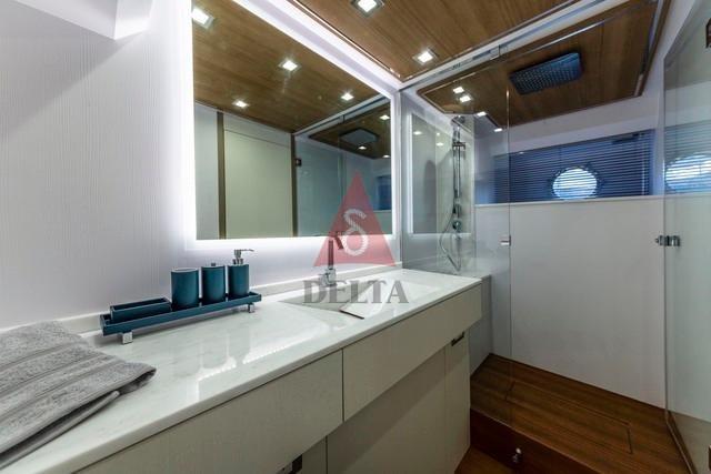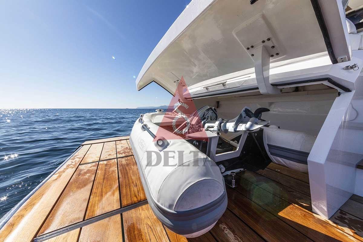 En passant la porte, vous vous retrouvez dans une dinette lumineuse avec un grand canapé, des tables en cristal, un plateau en marbre, une télévision rétractable et une double position de conduite signée Besenzoni. La position de conduite permet une maniabilité facile et le grand pare-brise une vue large et complète. Le tableau de bord suspendu dispose de deux écrans tactiles multifonctions de 12 » pour la gestion de tous les instruments de bord: des caméras au pilote, de l’écho au radar en passant par le GPS.