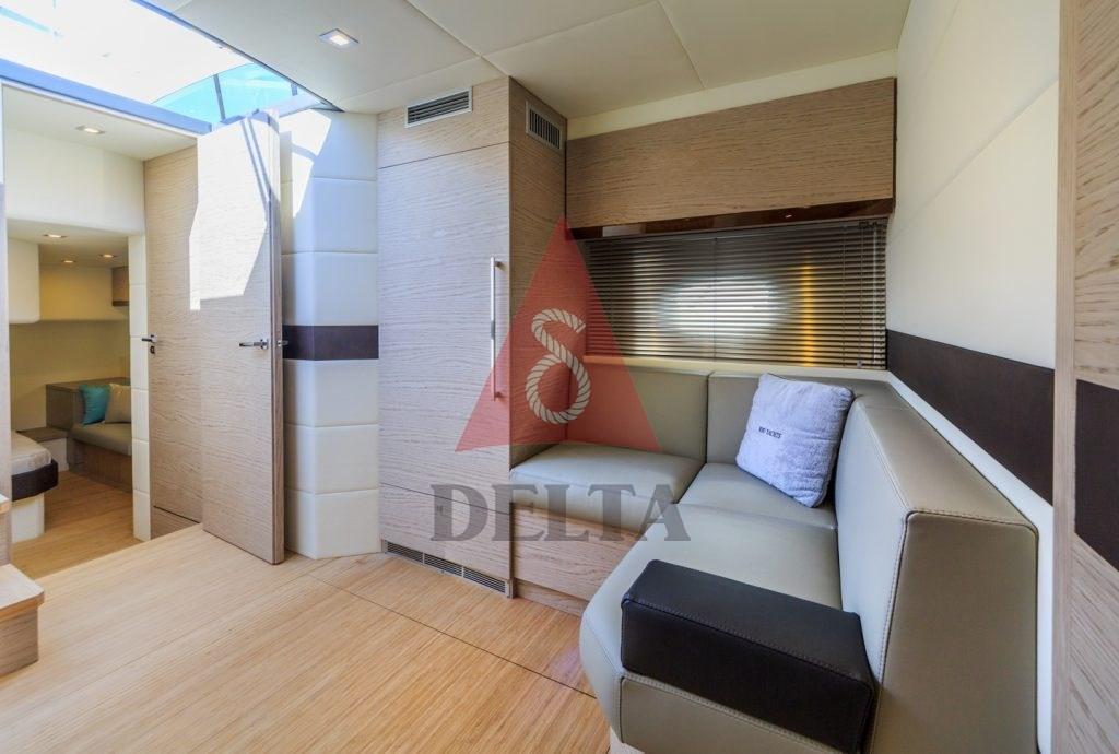 Le cockpit en teck est unique en son genre : il est vraiment grand (8 mètres carrés) et « tout plat », il combine cockpit et timonerie, pour privilégier la jouissance des espaces extérieurs et la convivialité avec les amis et les invités. Meublé d’un grand canapé, de deux tables, d’une grande terrasse arrière convertible, d’une télévision rétractable et d’une confortable cuisine extérieure équipée d’un évier, d’un vitrocéramique, d’un réfrigérateur et d’un micro-ondes, il est divisé par une porte rétractable qui se ferme vous permet de profiter du meilleur de la climatisation par temps chaud, de fermer la coque plus en toute sécurité ou tout simplement d’avoir plus d’intimité lors d’un apéritif sur le quai, mais l’ouverture disparaît presque sur la droite créant un espace unique et sans divisions.