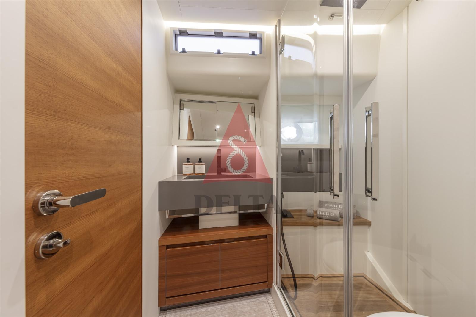 Le style de l’intérieur, frais et lumineux, couple laque blanche avec un teck blond. La continuité entre l’intérieur et l’extérieur, grâce aux grandes fenêtres d’ouverture et aux deux terrasses latérales descendantes, permet une vie à bord toujours en plein air. Parce que le vrai luxe, c’est la liberté sans frontières.