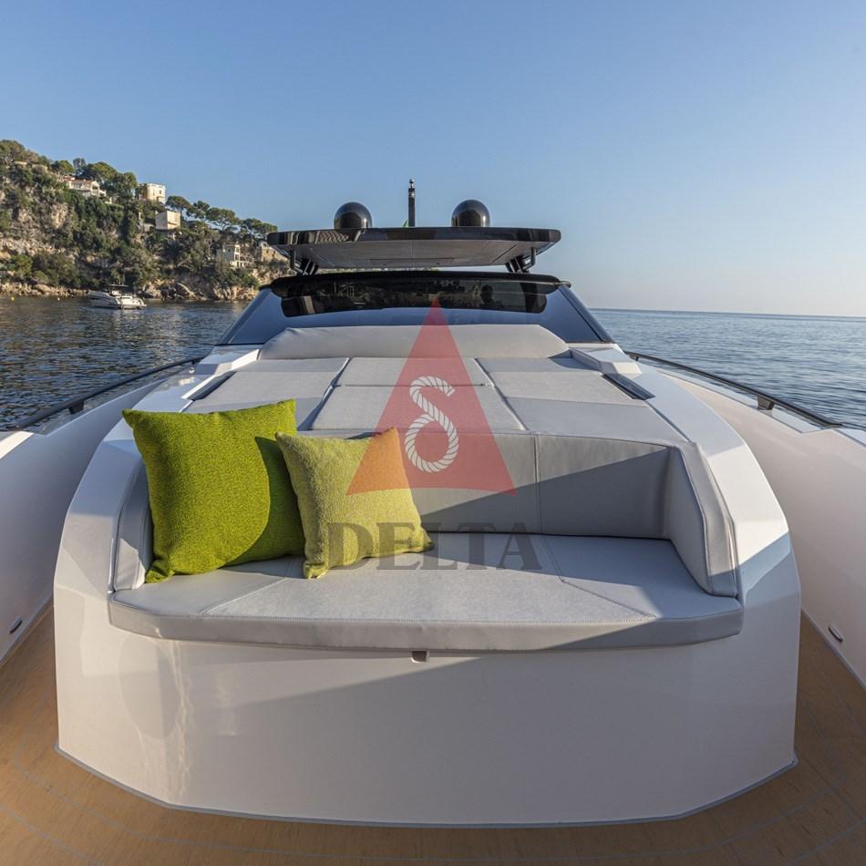 Le siège du conducteur, technologique et moderne, est protégé par un grand et ferme Bimini. Le passage vers la proue est large, confortable et sûr : en quelques pas, vous arrivez au canapé double en face de la proue de la terrasse sur le rouf.
