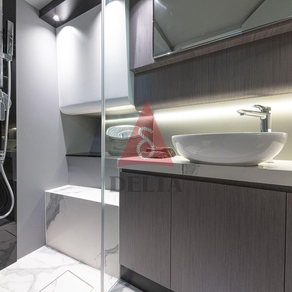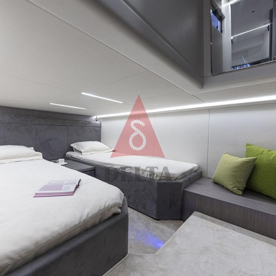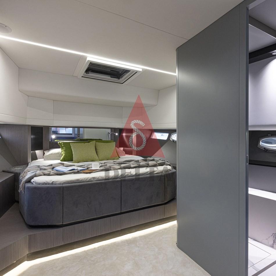 L’intérieur lumineux est représenté par un espace ouvert polyvalent et intelligent. Deux cabines, une salle de bain et une répartition exceptionnelle de l’espace pour un bateau de 13 mètres.