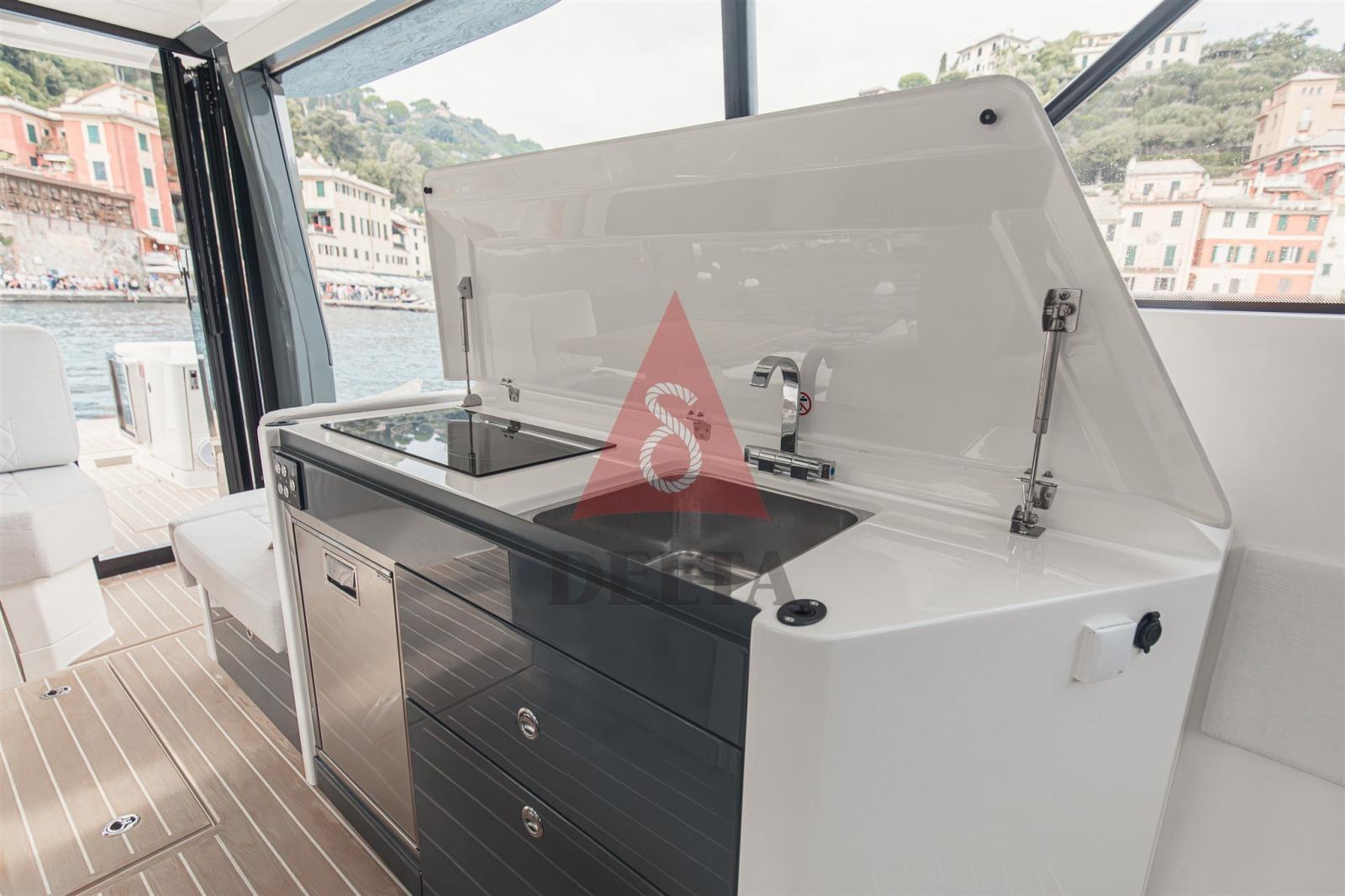 Coque infusée sous vide - gelcoat RAL 9010 (blanc) - Toit en toile coulissant électriquement - Glacière intégrée dans le pont arrière - Porte-gobelets - Essuie-glace - Terrasses ouvrables des deux côtés (près de 4 mètres de long)