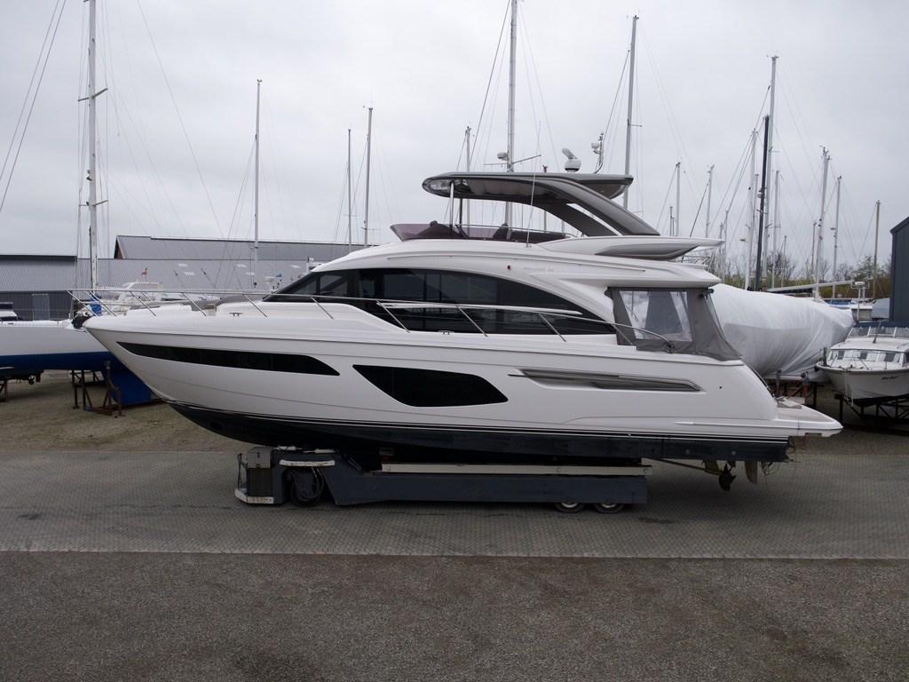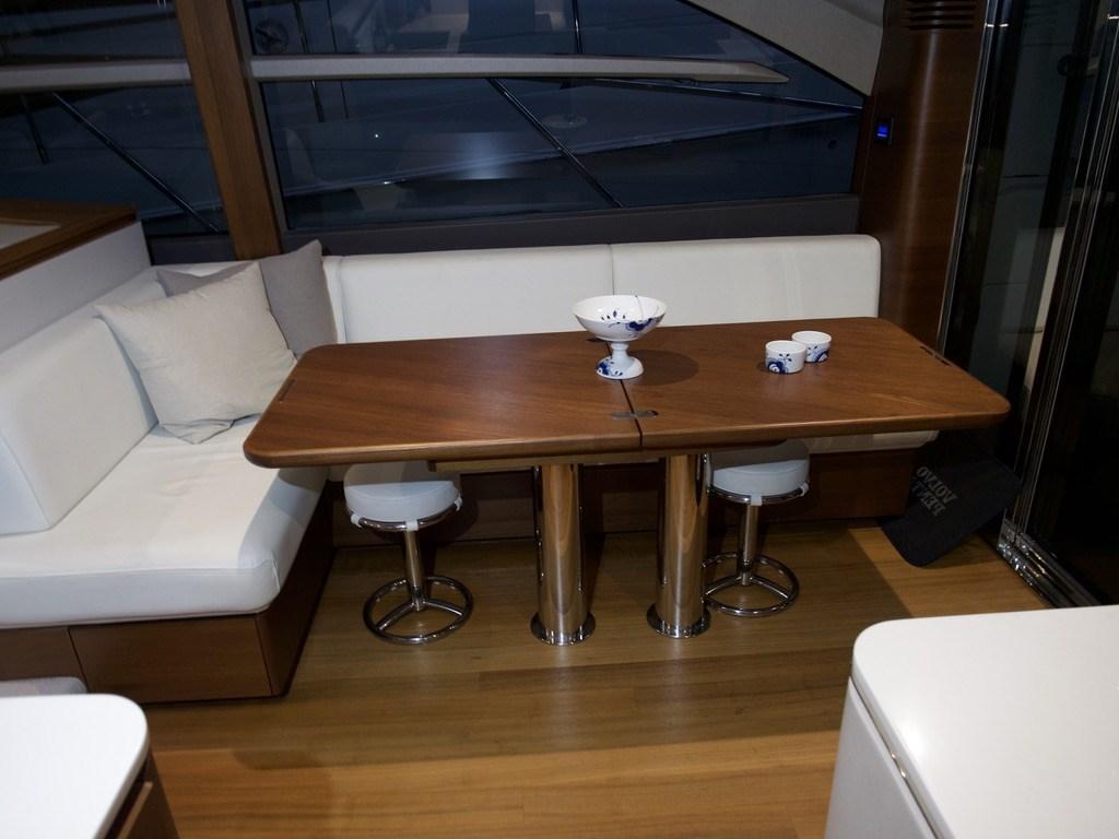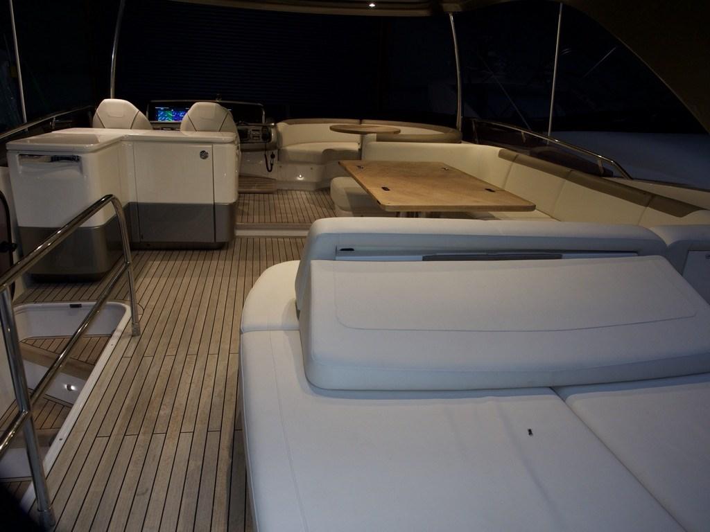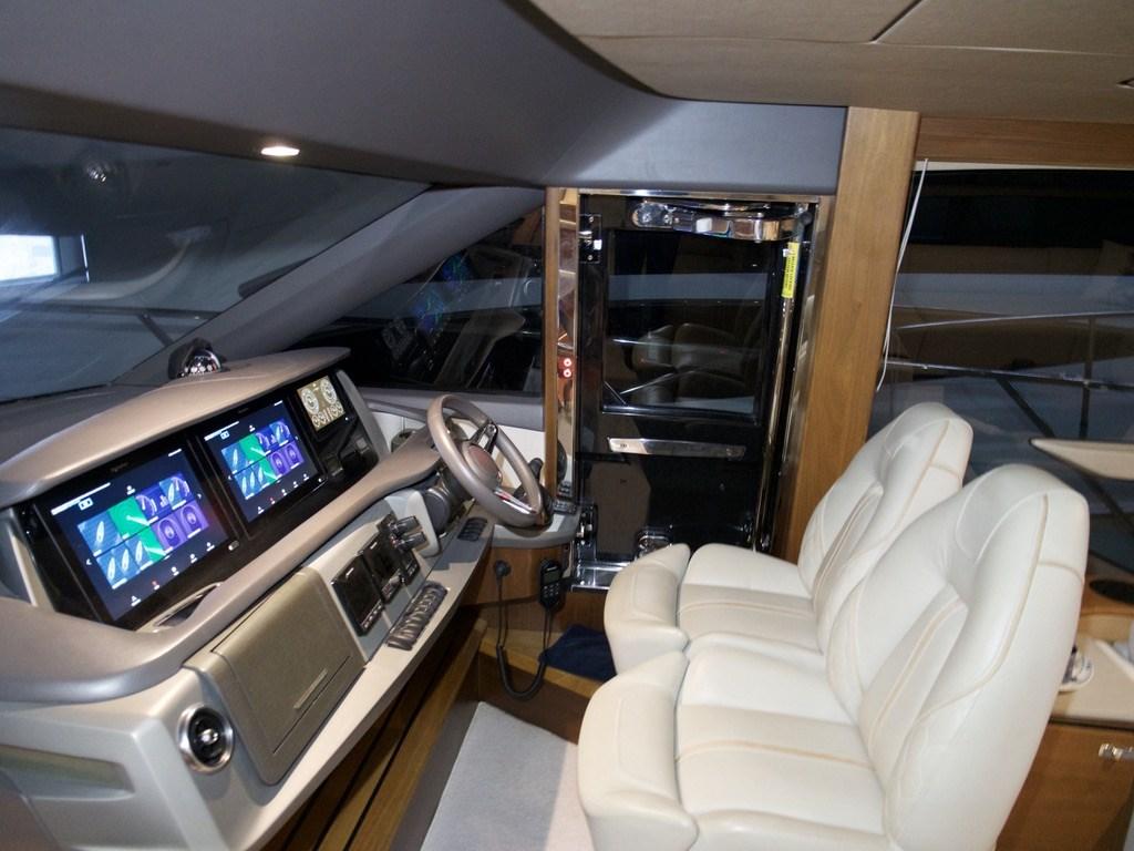 Le flybridge dispose d’un toit rigide en fibre de carbone avec toit ouvrant rétractable, d’un bar humide, de nombreux sièges et d’un pare-brise à 3 côtés en polycarbonate.
