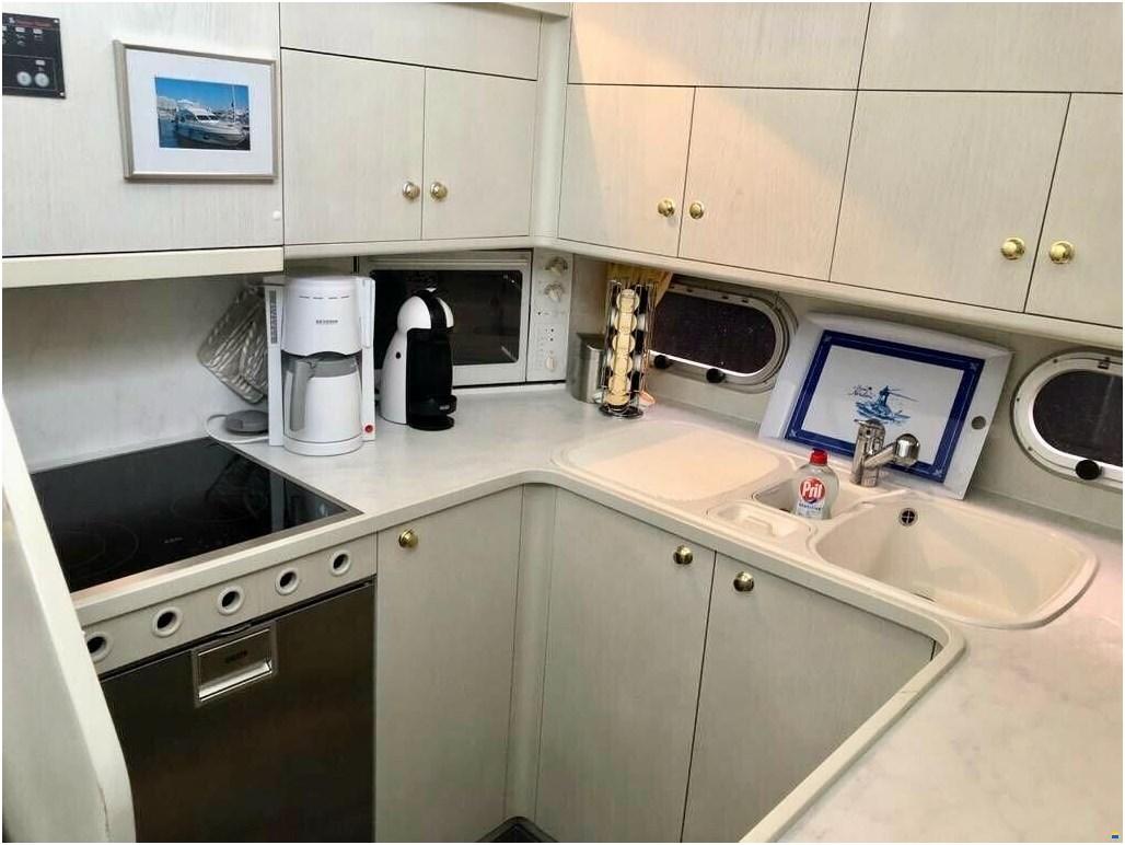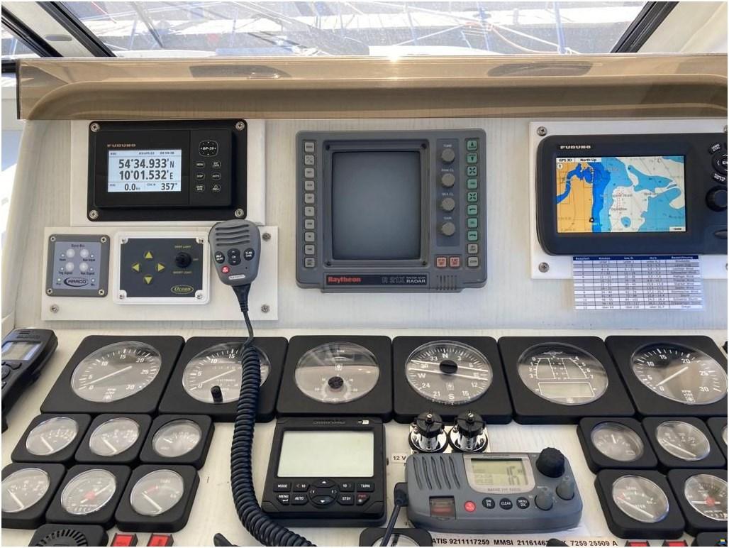 Double barre à roue, Grue de flybridge (E-Ankerwinsch), Plateforme arrière, Pompe de cale automatique, Guindeau électrique, Echelle de bain.