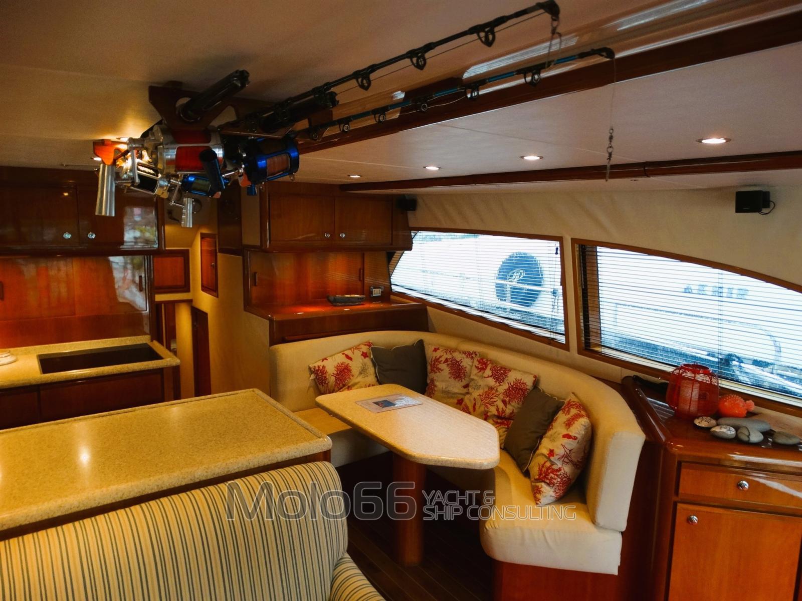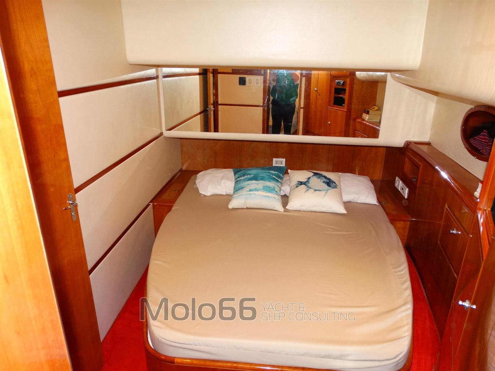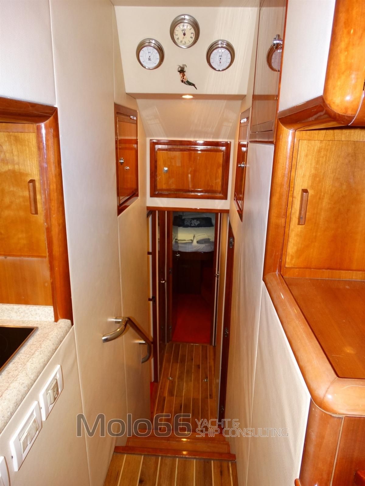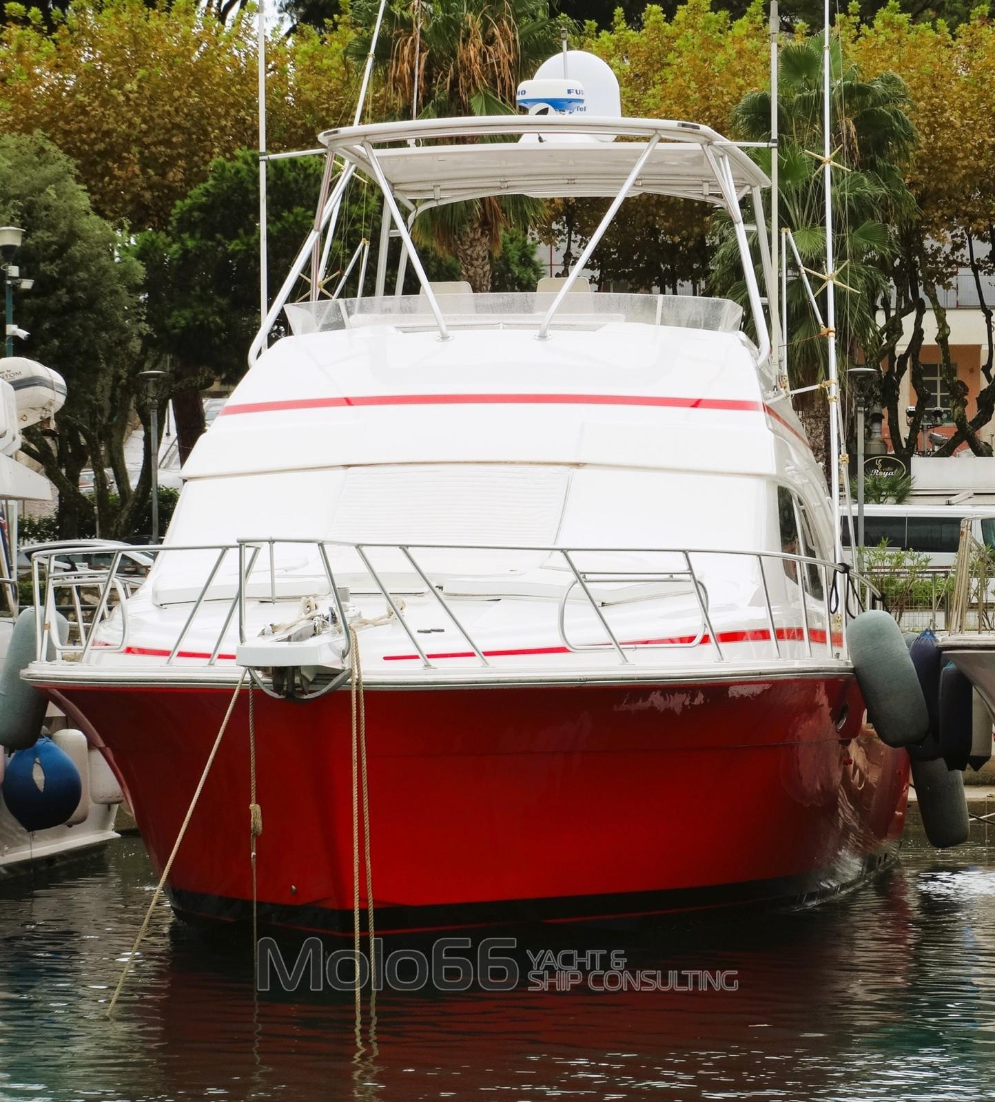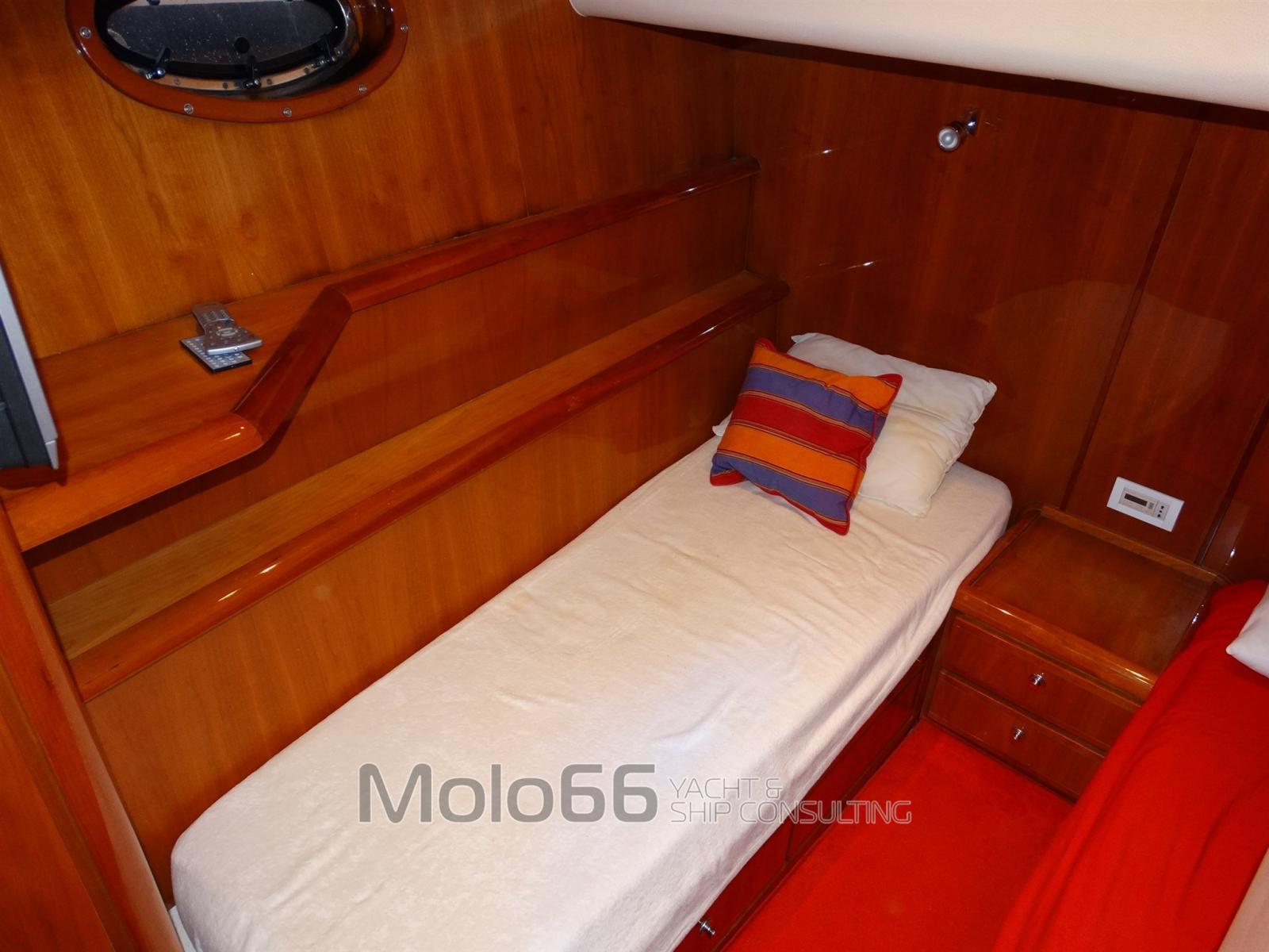 Alarme gaz, Alarme moteur, Alarme de pompe de cale, Eau sous pression, Couleur spéciale, Douche de cockpit, Phares fixes arrière, Flaps hydrauliques, Bossoirs pour annexe (Su passerella), Hard top (Apribile), Extincteur(s) fixe(s), Lavage de chaine (Con doccia a prua), Éclairage de courtoisie, Passerelle (Idraulica con gruette), Plateforme arrière, Porte latérale, Cockpit en teck, Prise de quai, Connexion eau sous pression à quai, Onduleur, Guindeau électrique, Echelle de bain, Corne, Winch électrique avant.