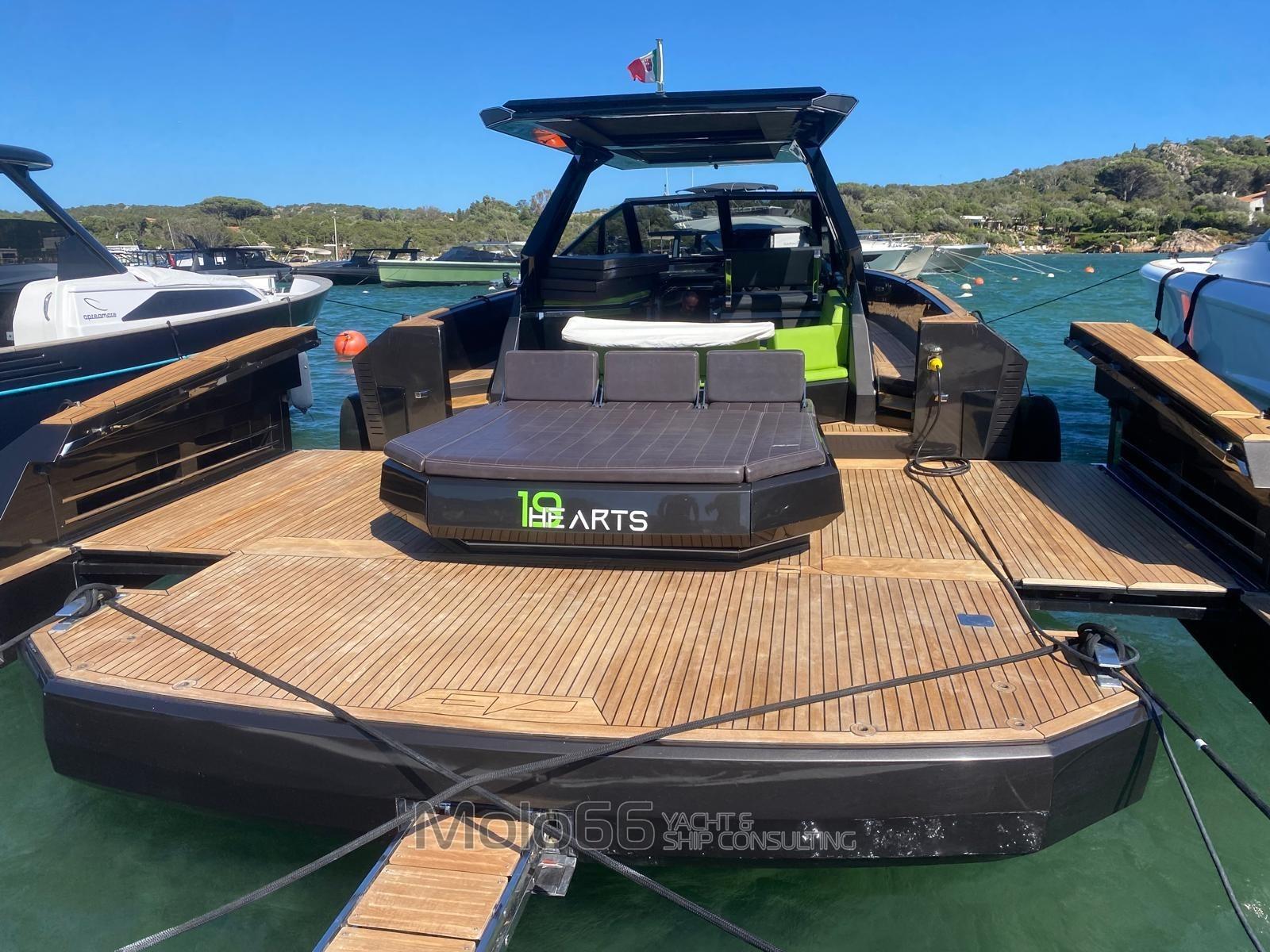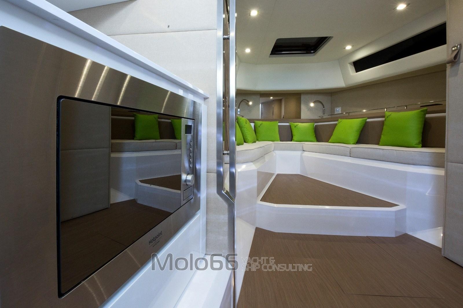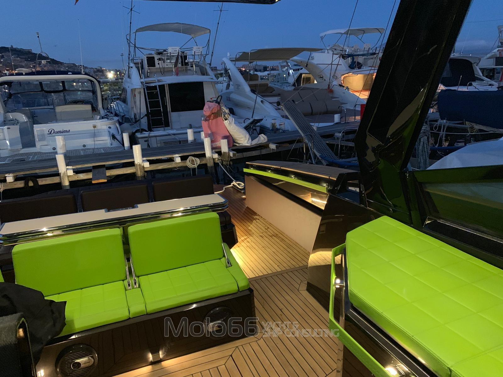 Alarme moteur, Alarme de pompe de cale, Ouverture du compartiment moteur électrique, Auto Dynamic Trim Interceptor, Eau sous pression, Taquets pliants, Passavant en teck, Couleur spéciale, Douche de cockpit, Flaps électriques, Hard top, Extincteur(s) fixe(s), Compresseur de plongée, Indicateurs de flaps, Lavabo dans le cockpit, Éclairage de courtoisie, Spots sous-marins, Passerelle, Plateforme arrière, Pompe de cale automatique, Cockpit en teck, Prise de quai, Guindeau électrique, Echelle de bain, table de cockpit, Table pliante de salon, Corne.