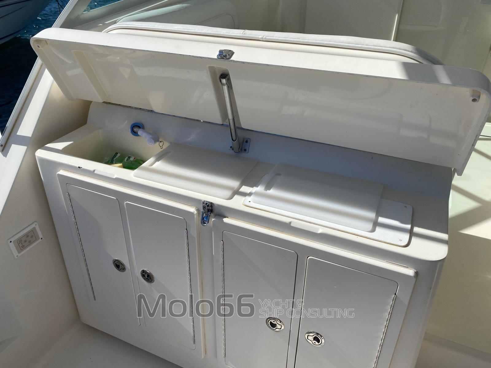 Alarme gaz, Alarme moteur, Alarme de pompe de cale, Ouverture du compartiment moteur électrique, Eau sous pression, Douche de cockpit, Double barre à roue, Phare de poursuite, Flaps électriques, Hard top, Extincteur(s) fixe(s), Indicateurs de flaps, Éclairage de courtoisie, Passerelle (idraulica), Plateforme arrière, Porte latérale, Prise de quai, Guindeau électrique, Echelle de bain, Corne.