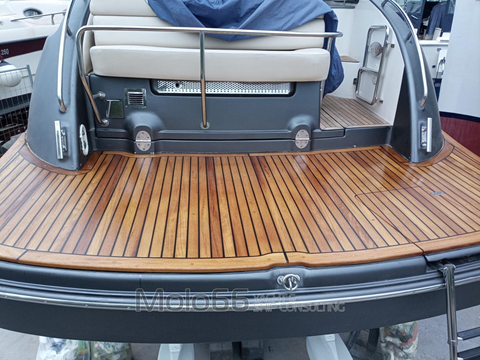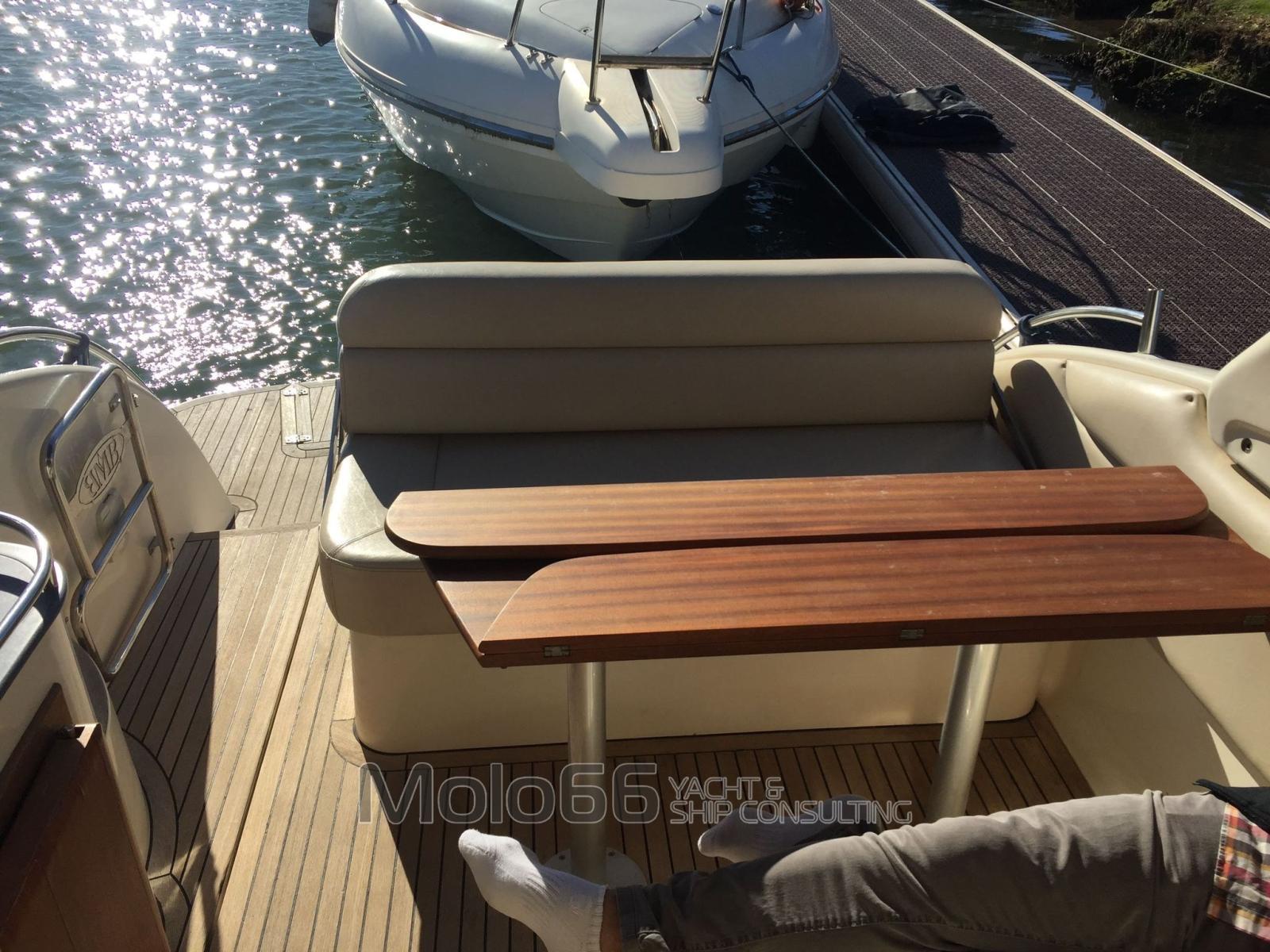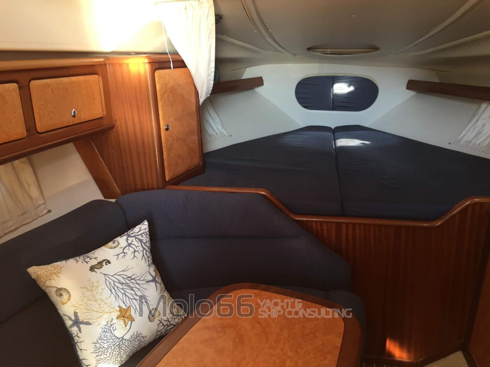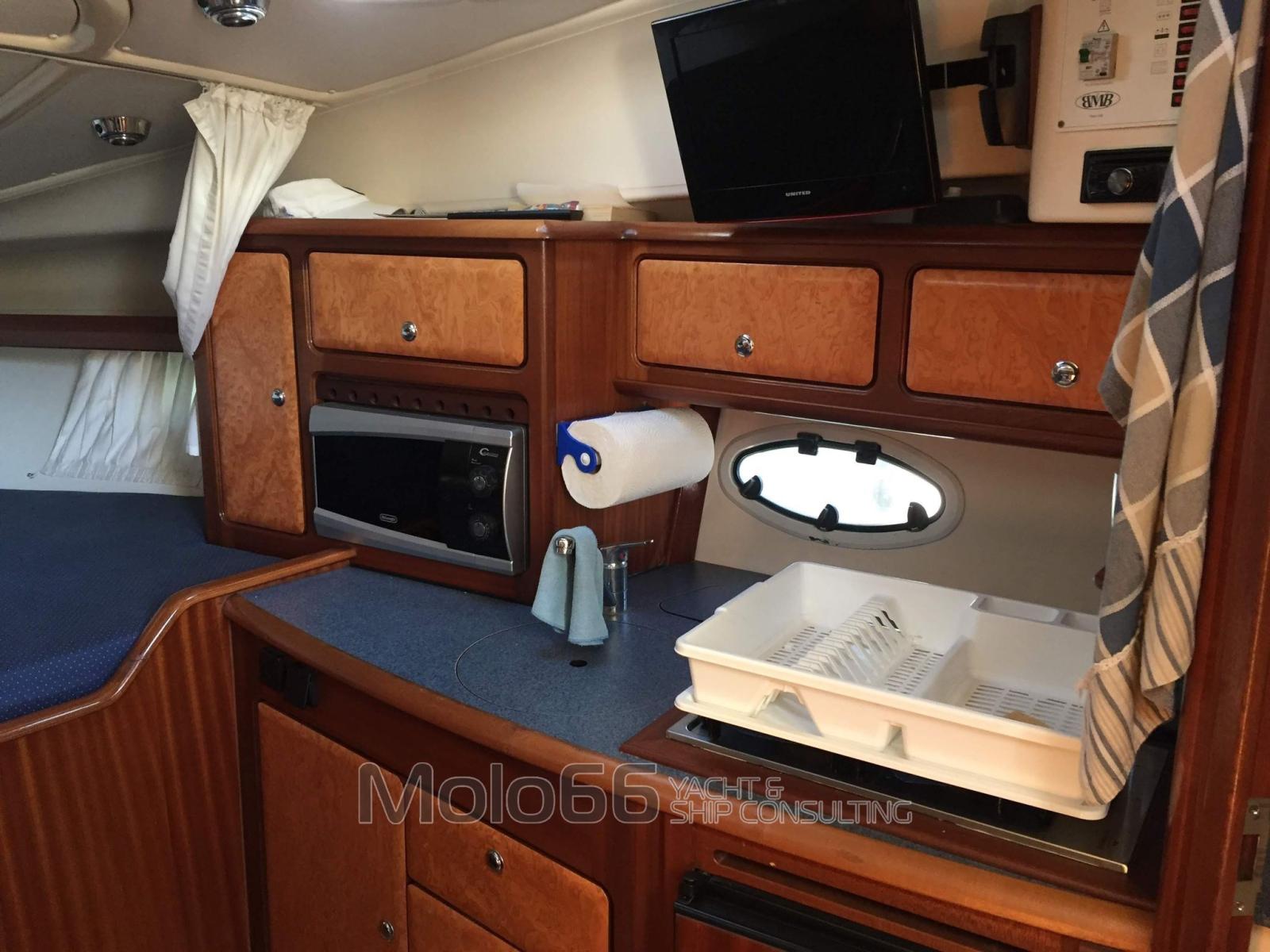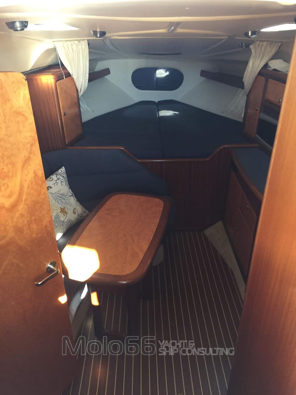 Alarme gaz, Alarme moteur, Alarme de pompe de cale, Eau sous pression, Couleur spéciale, Douche de cockpit, Flaps électriques, Cockpit en teck, Guindeau électrique, Echelle de bain.