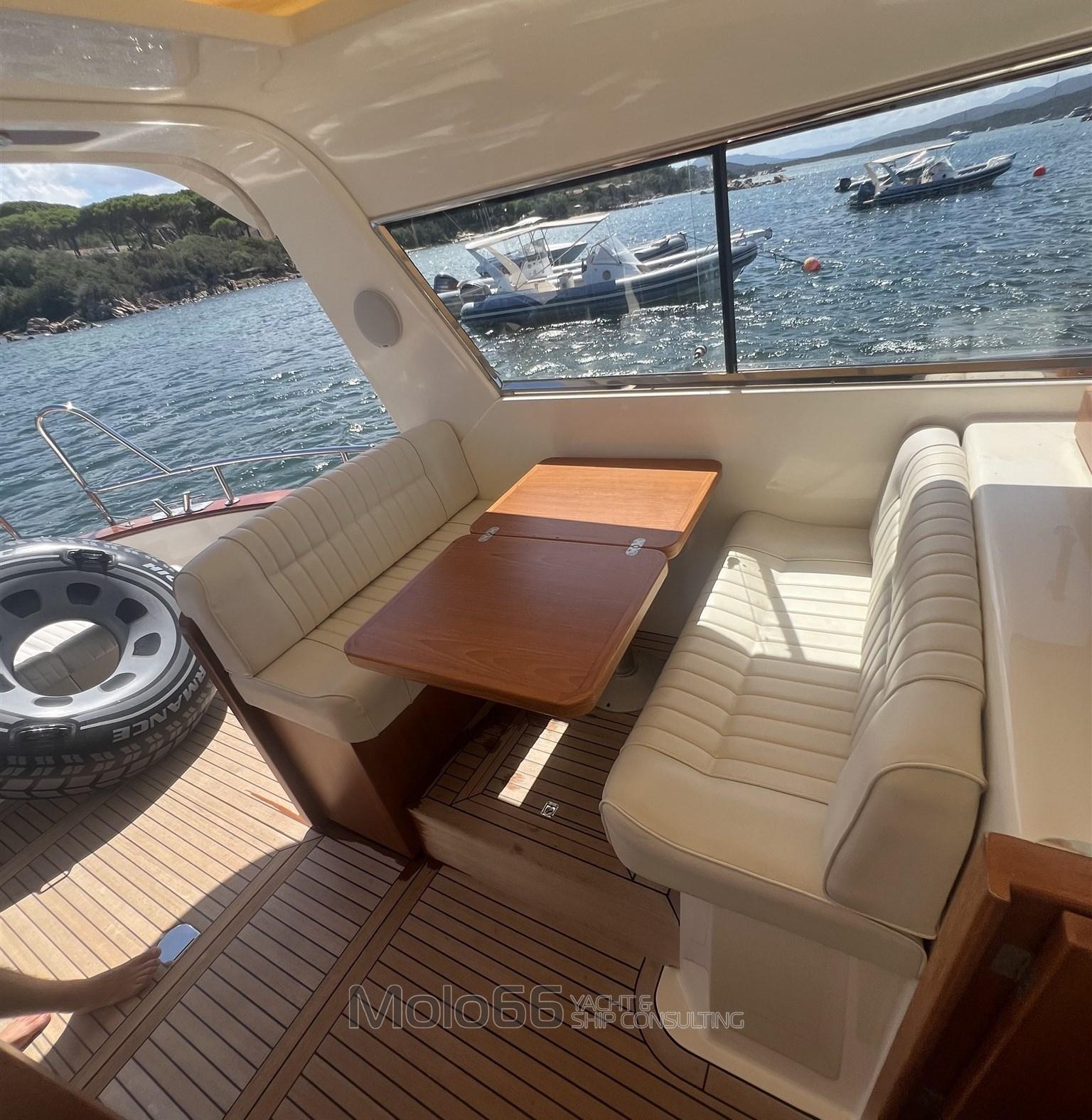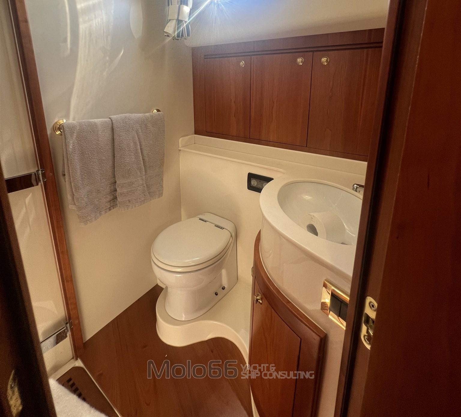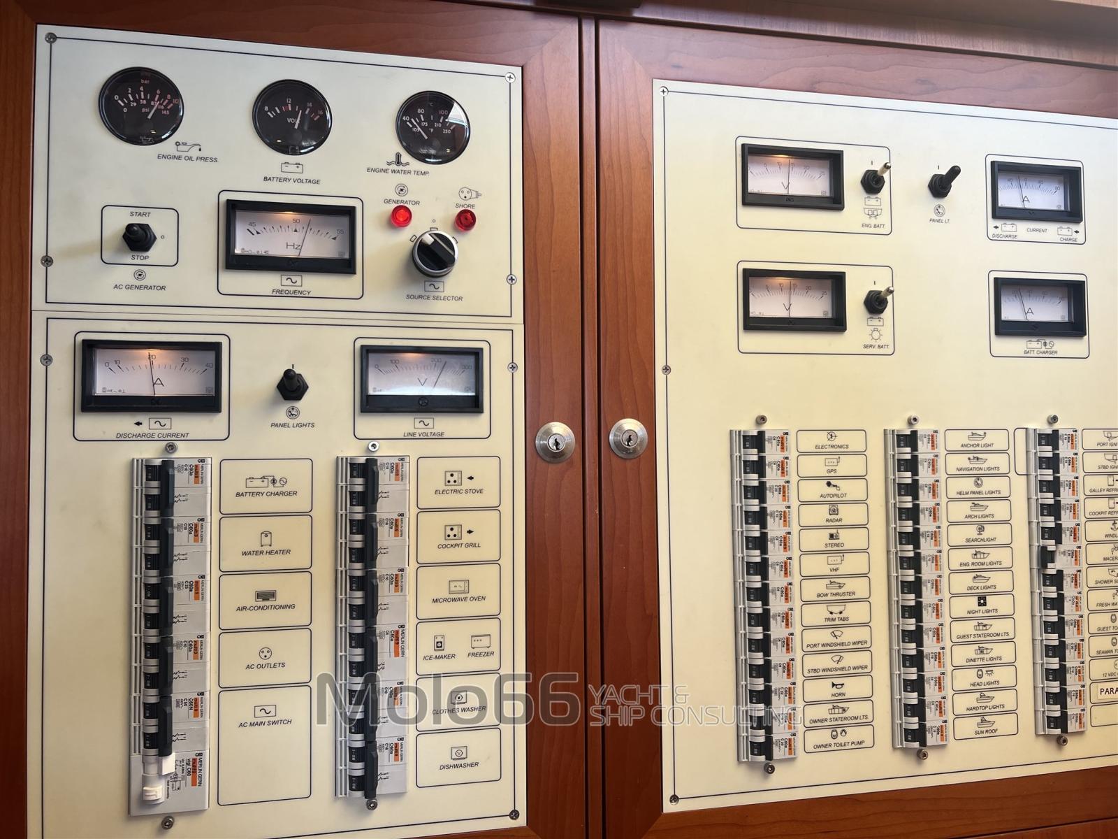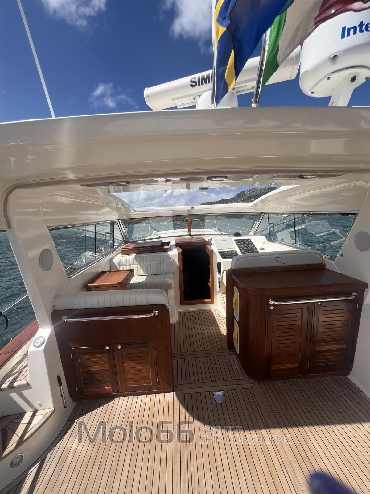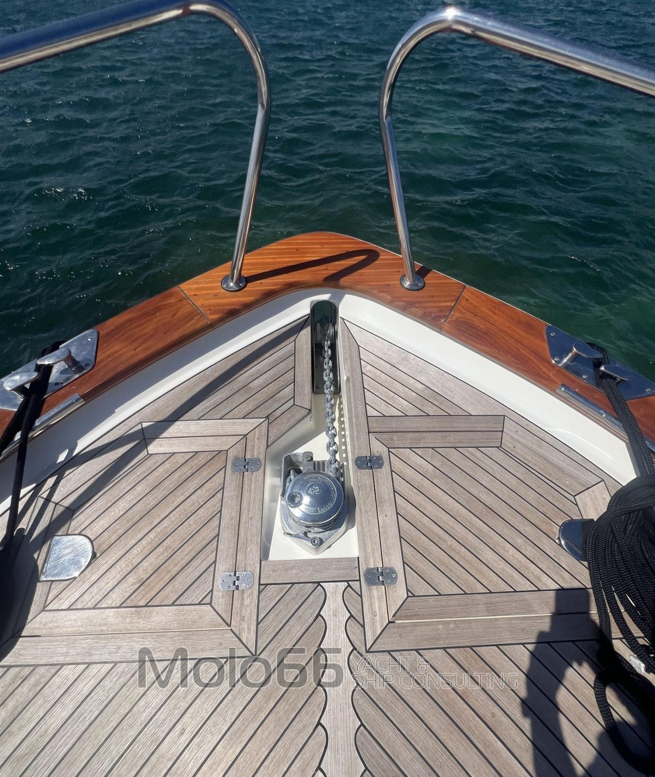 Eau sous pression, Passavant en teck, Couleur spéciale, Douche de cockpit, Phare de poursuite, Flaps hydrauliques, Hard top, Extincteur(s) fixe(s), Lavage de chaine, Lavabo dans le cockpit, Passerelle, Plateforme arrière, Cockpit en teck, Prise de quai, Onduleur, Echelle de bain, table de cockpit, Pont en teck.