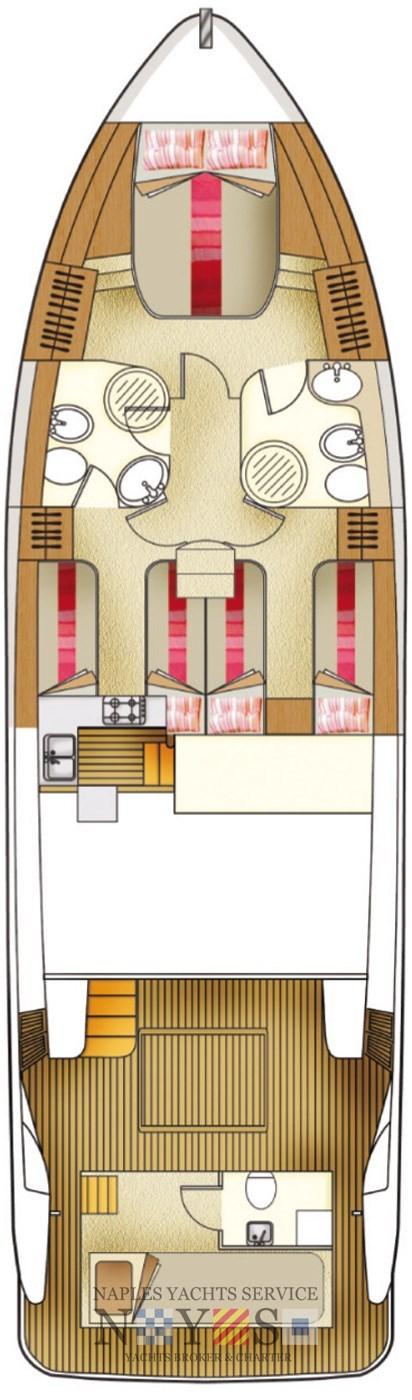 Alarme moteur, Alarme de pompe de cale, Eau sous pression, Douche de cockpit, Hélice de rechange, Flaps hydrauliques, Plateforme arrière, Pompe de cale automatique, Cockpit en teck, Prise de quai, Connexion eau sous pression à quai, Onduleur, Guindeau électrique, Echelle de bain, Annexe, Filières avec sortie latèrale.