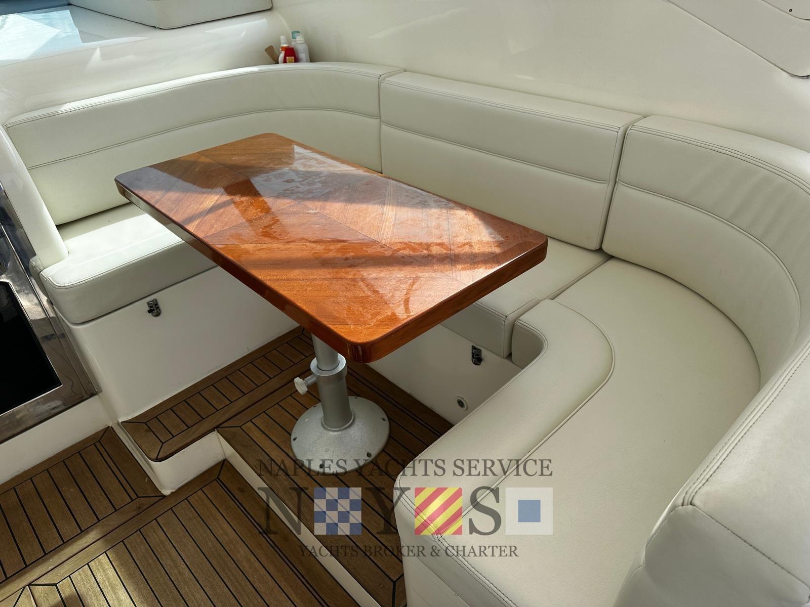 Cockpit avec pav. en teck avec joint noir. Plate-forme en fibre de verre avec pv. en teck avec joint noir Dinette à droite avec table centrale