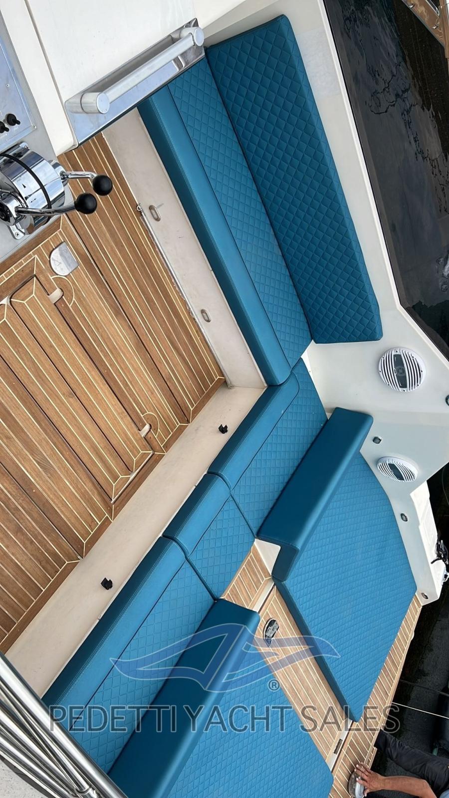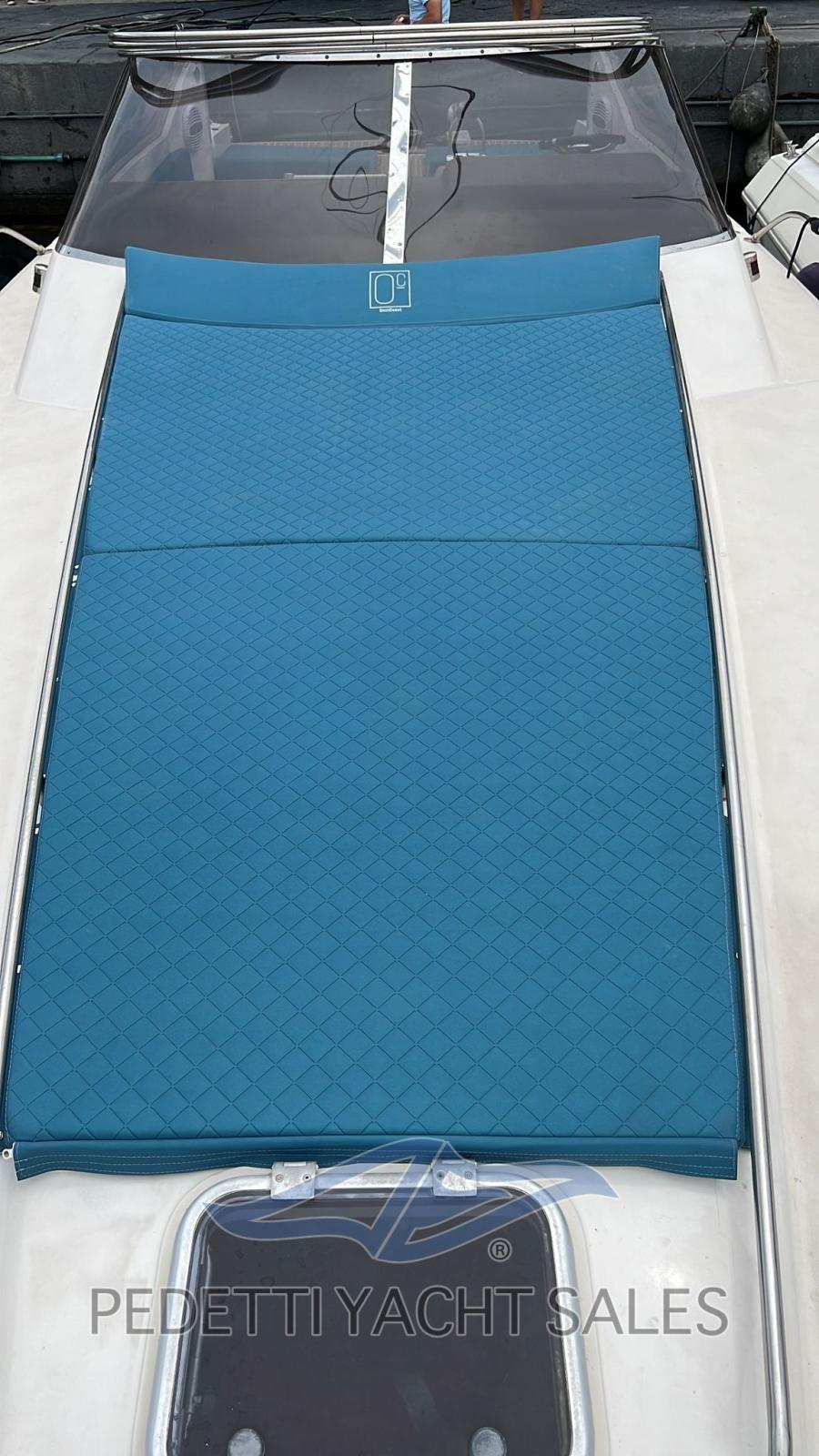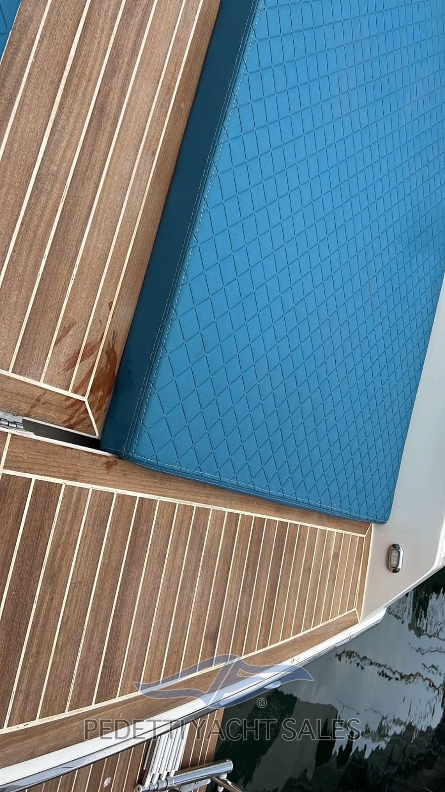 Instruments Volvo Penta, panneau de commande refait, nouveau système électrique total, système audio à 4 haut-parleurs Hertz avec caisson de basses, nouveaux feux LED, en 2022 les travaux suivants ont été effectués : treuil révisé, nouvelle sellerie, auvent en acier, bottazzo en acier, garde-corps en acier, nouveau pare-brise, nouveau réfrigérateur, sellerie interne, cales remplacées, chaudière révisée, télécommande du guindeau, réservoirs débarqués et reconditionnés. Aménagement intérieur de canapés contrastés pouvant être convertis en lits, salle de bain à gauche, chambre double aux dimensions généreuses à l’avant.