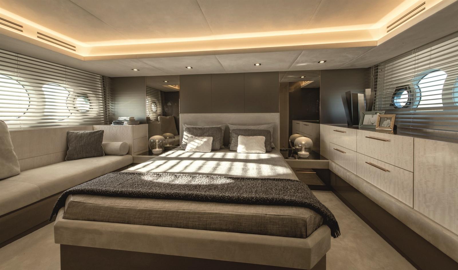 Le décor moderne unique et sophistiqué du MCY 66 est une caractéristique frappante dans tout le salon principal et toutes les cabines. Les tissus haut de gamme, les pierres naturelles et les cuirs italiens ne sont que quelques-uns des matériaux de qualité supérieure disponibles sur ce yacht. D’élégants éléments en marbre brillant enrichis d’une légère touche de cuivre sont les principales caractéristiques de la nouvelle décoration intérieure du MCY 66. L’utilisation de matériaux réfléchissants, de miroirs et de bois laqué, en combinaison avec de larges fenêtres latérales, renforce la luminosité de la lumière naturelle. Afin de satisfaire les besoins et les souhaits du propriétaire, Monte Carlo Yachts propose une personnalisation complète de tous les éléments de design et d’aménagement intérieurs.