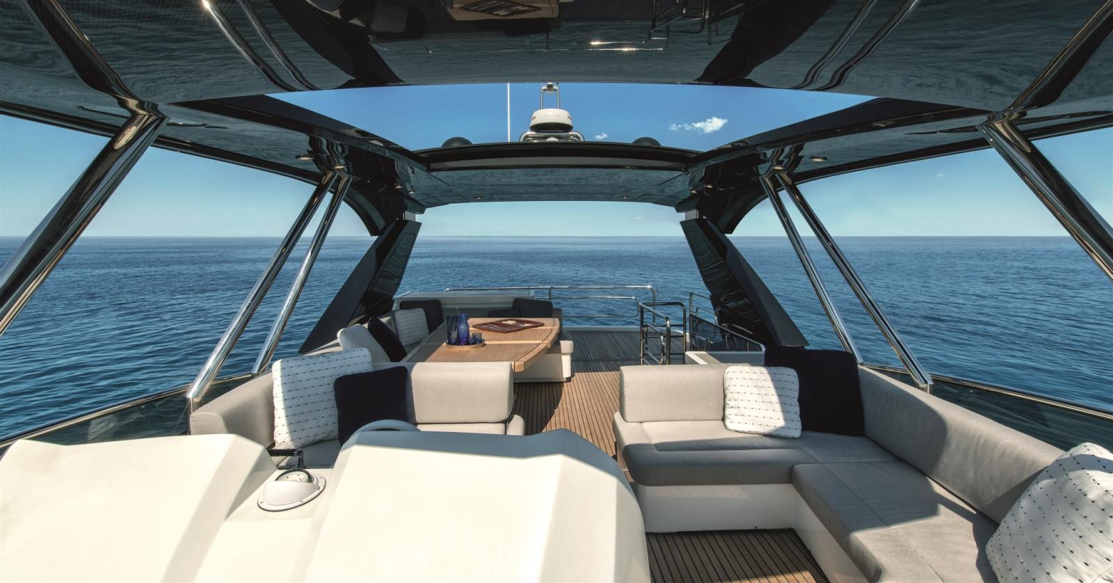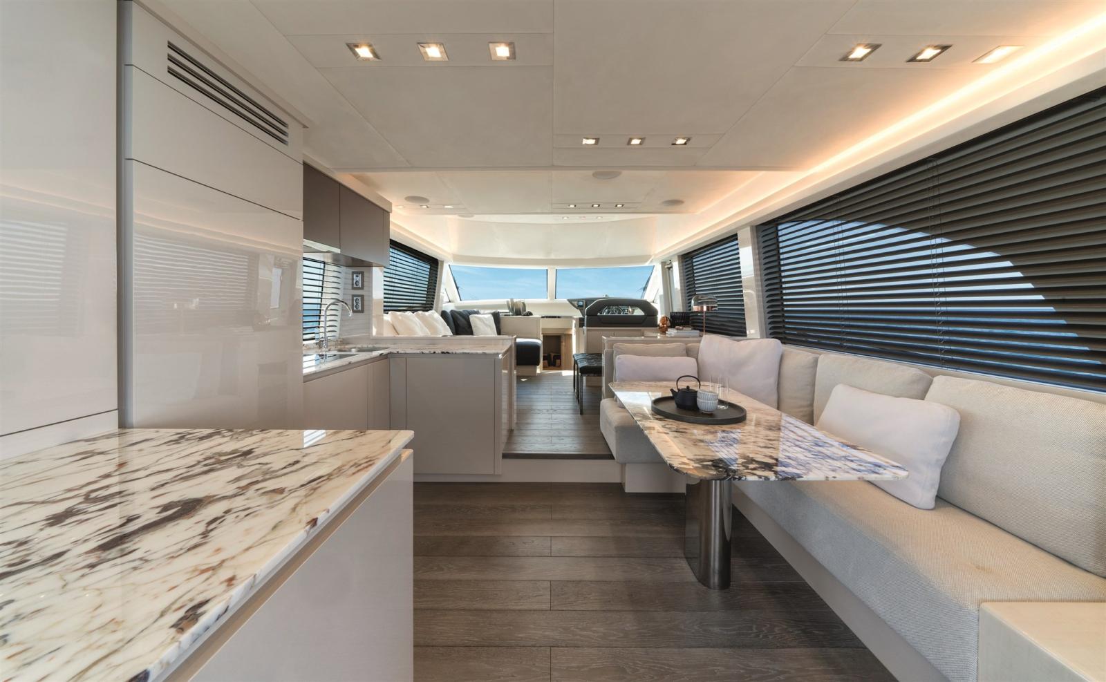 Le MCY 66 dispose d’espaces intérieurs incroyables pour un yacht de sa catégorie. Les hublots supplémentaires à l’avant donnent au yacht une apparence extérieure prolongée et offrent une meilleure exposition à la lumière naturelle dans toute la cabine VIP. Le hublot emblématique de MCY agrandi renforce l’atmosphère intime et relaxante de la cabine propriétaire. Les cabines invités avec leurs salles de bains dédiées suivent les volumes spacieux communs aux autres espaces de ce nouveau modèle. Les larges brèches des pavois permettent une augmentation significative en termes de volumes intérieurs et d’exposition à la lumière. Ceci est particulièrement mis en évidence sur le pont principal où le salon présente un espace ouvert entre la cuisine arrière et l’espace de vie situé à l’avant.