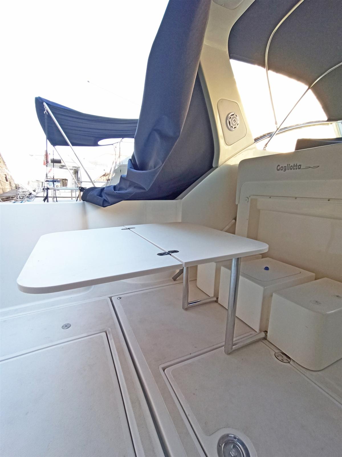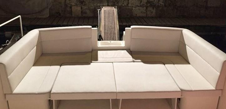 - Nouveau canapé avec tables en bois et convertible en fibre de verre en espace de bronzage dans le cockpit