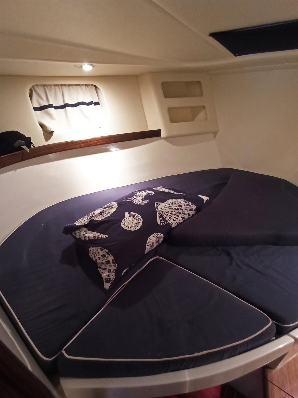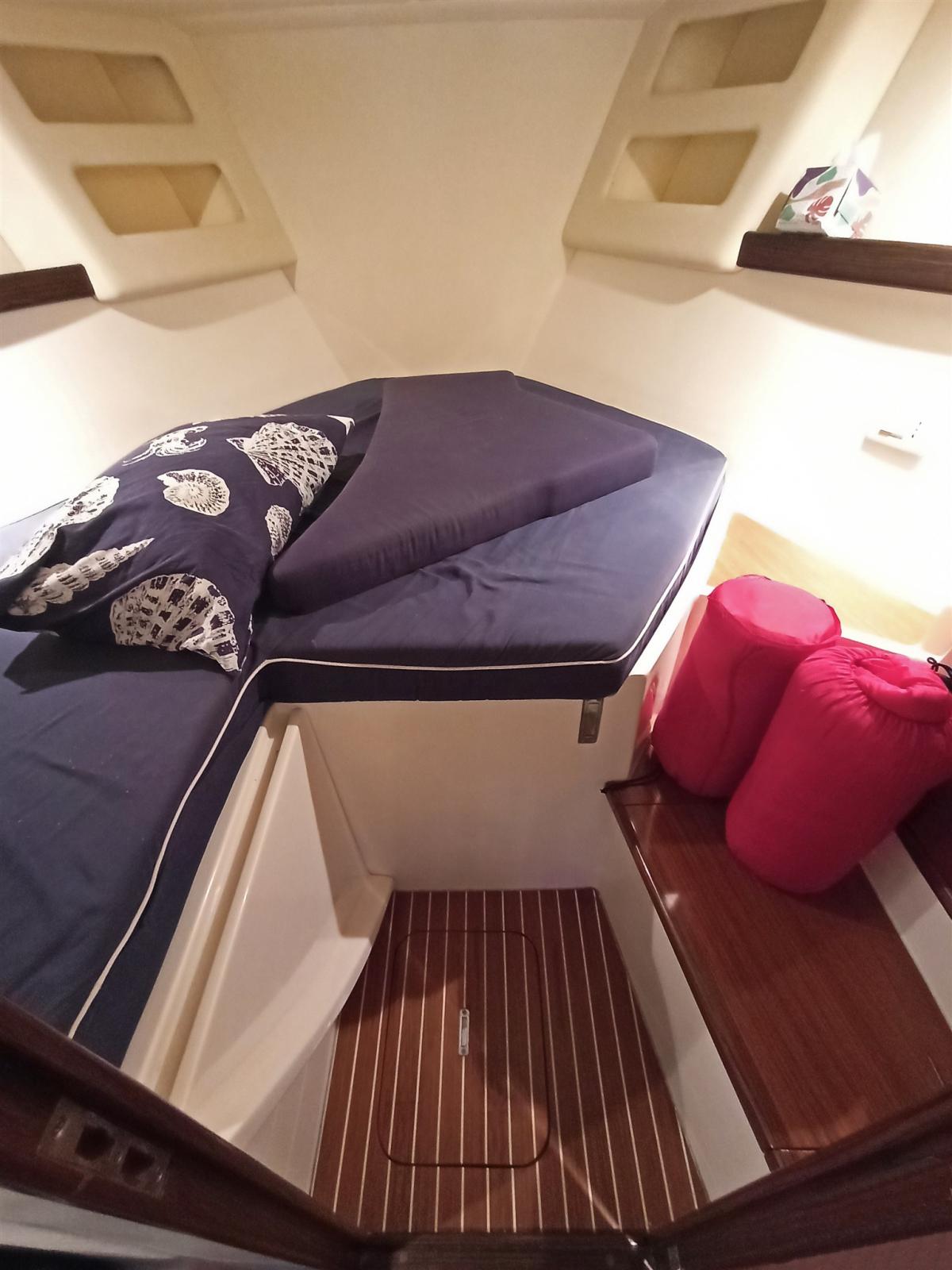 Cabine du propriétaire à l’avant avec un lit double extensible avec de grands casiers en dessous, des compartiments de garde-robe et de rangement