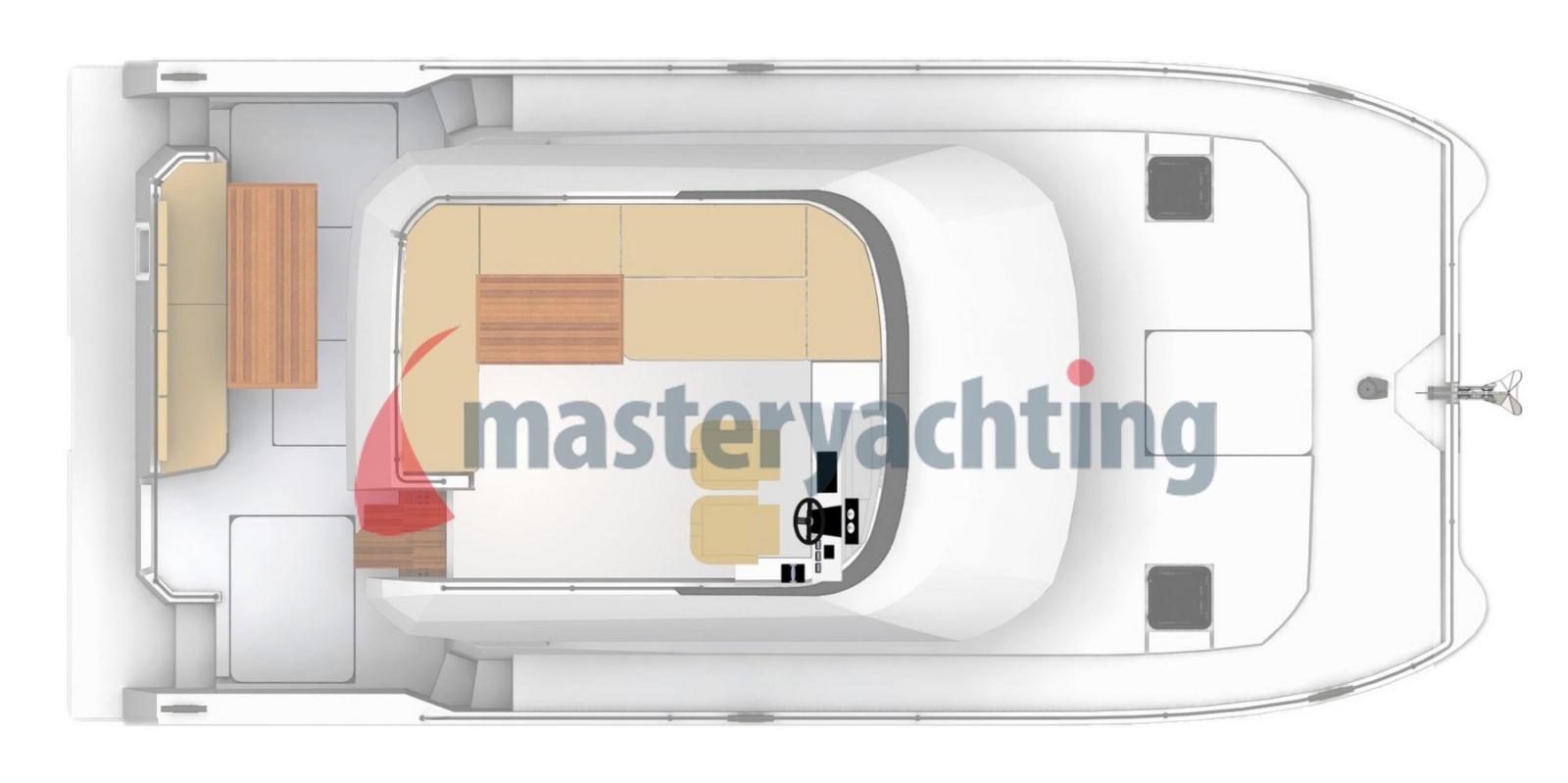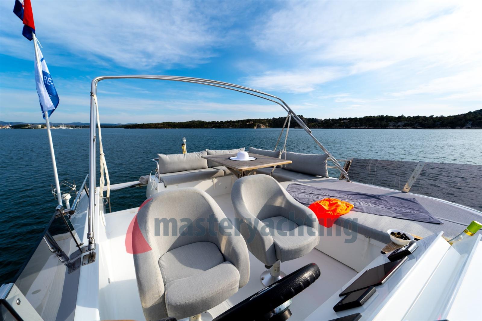 Alarme moteur, Eau sous pression, Chargeur de batterie (12 volt 80 amps), Douche de cockpit, Double barre à roue, Éclairage de courtoisie, Moteur d'annexe, Plateforme arrière (hydraulique immergeable), Pompe de cale automatique, Prise de quai, Guindeau électrique (Quick 100 w), Echelle de bain, table de cockpit, Annexe.