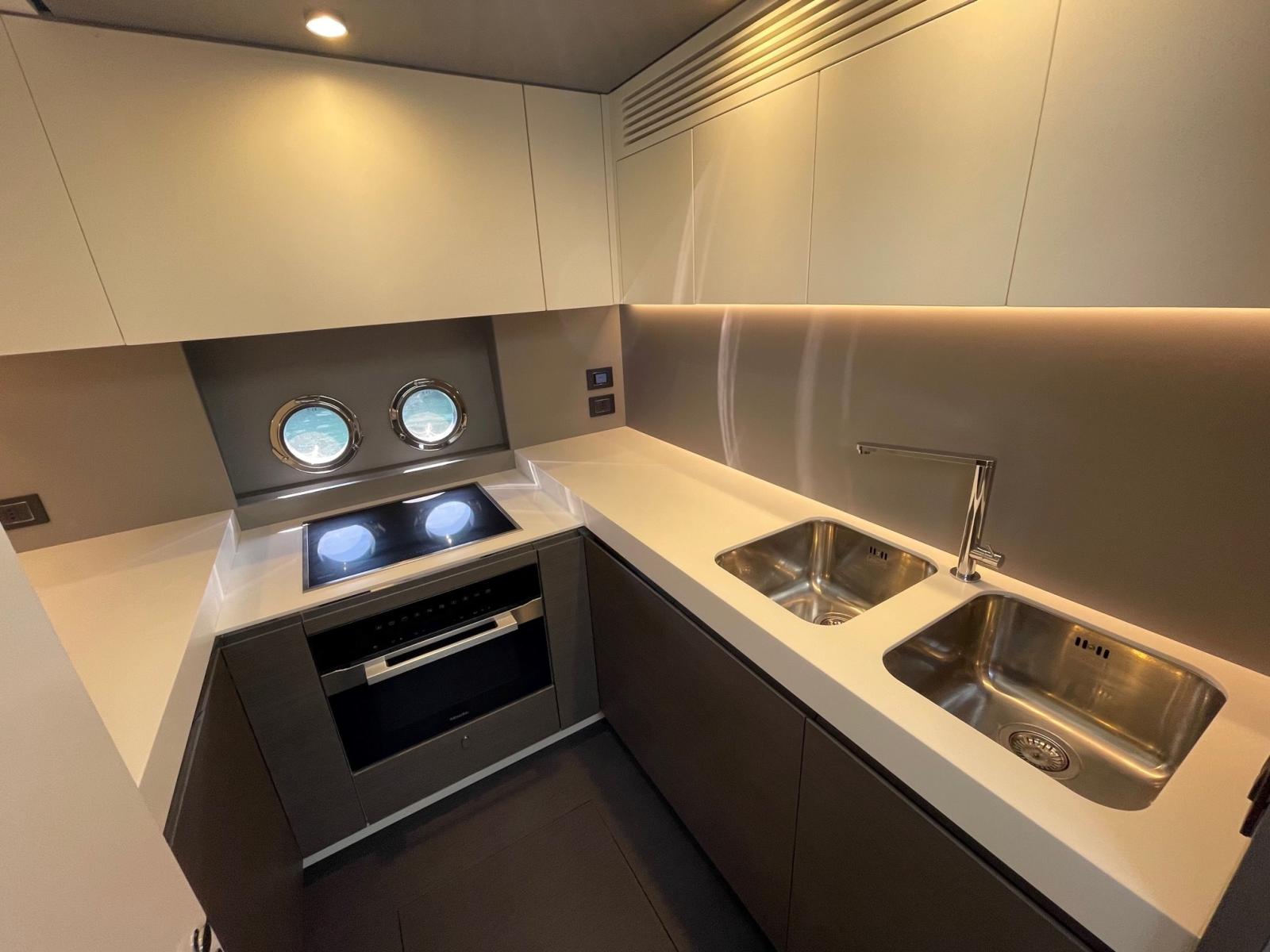 Réfrigérateur extérieur (cockpit), 2 Réfrigérateur intérieur (meuble salon et cuisine), 2 Machine à glaçons (cockpit et meuble salon), 2 Lave et sèche-linge (unités séparées), Lave-vaisselle, Four micro-ondes (+ réfrigérateur espace équipage), Plaque vitrocéramique, Winecooler (dans rangement sous la cuisine).