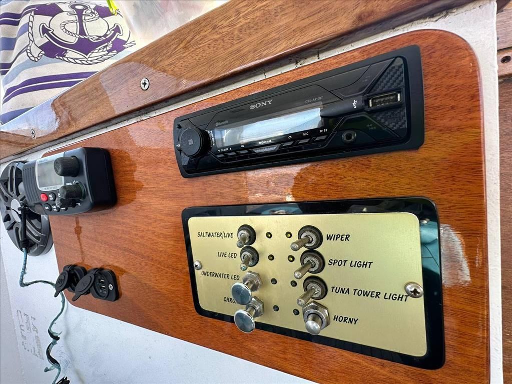 Échosondeur, gps, voiture pilote avec télécommande, Radar, vhf, panneau solaire 300W. Divergent 9 mètres,,6 porte-tonneau tubulaire,10 porte-tige encastré à l’arrière tout en acier anodisé de l’OCEAN. Prises pour bobines électriques.