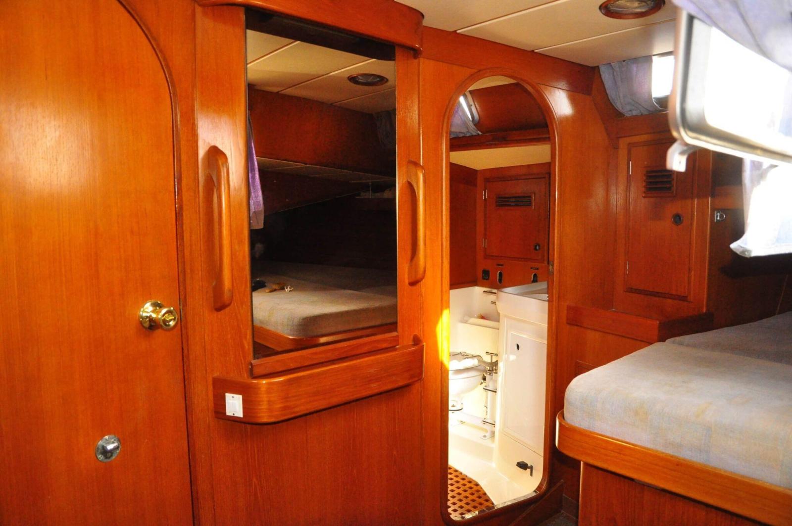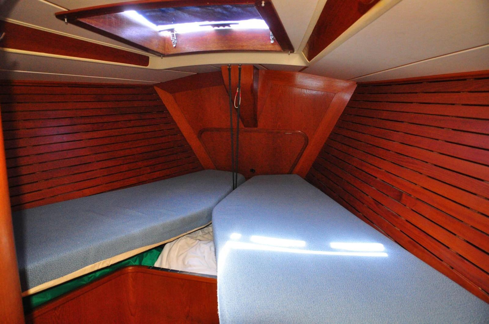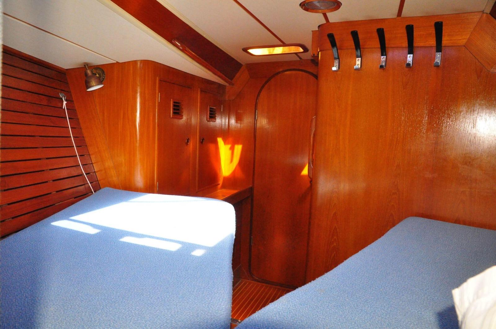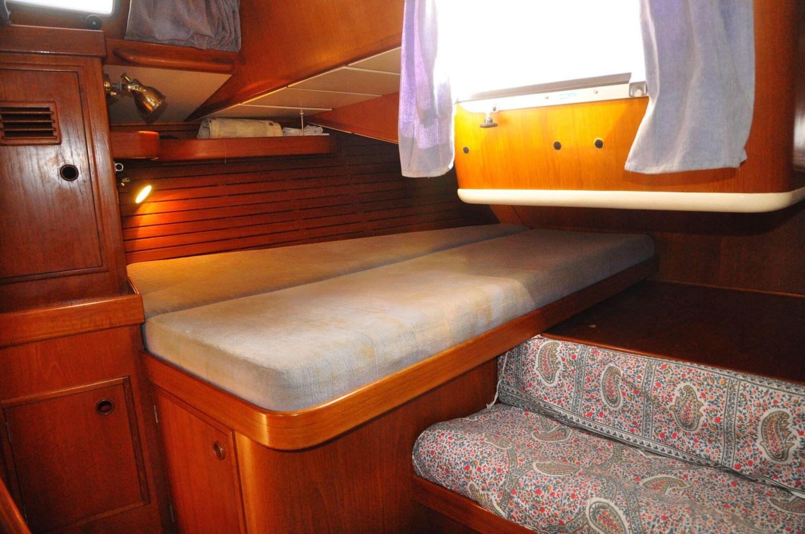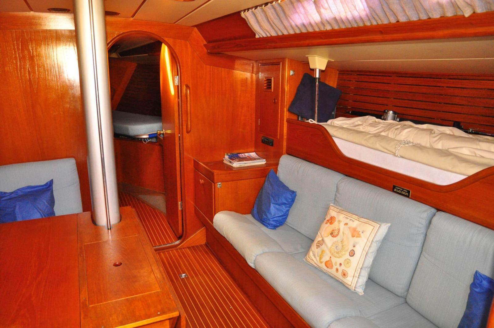 Double couchette et canapé central. La cabine est équipée d’étagères et d’une armoire suspendue.