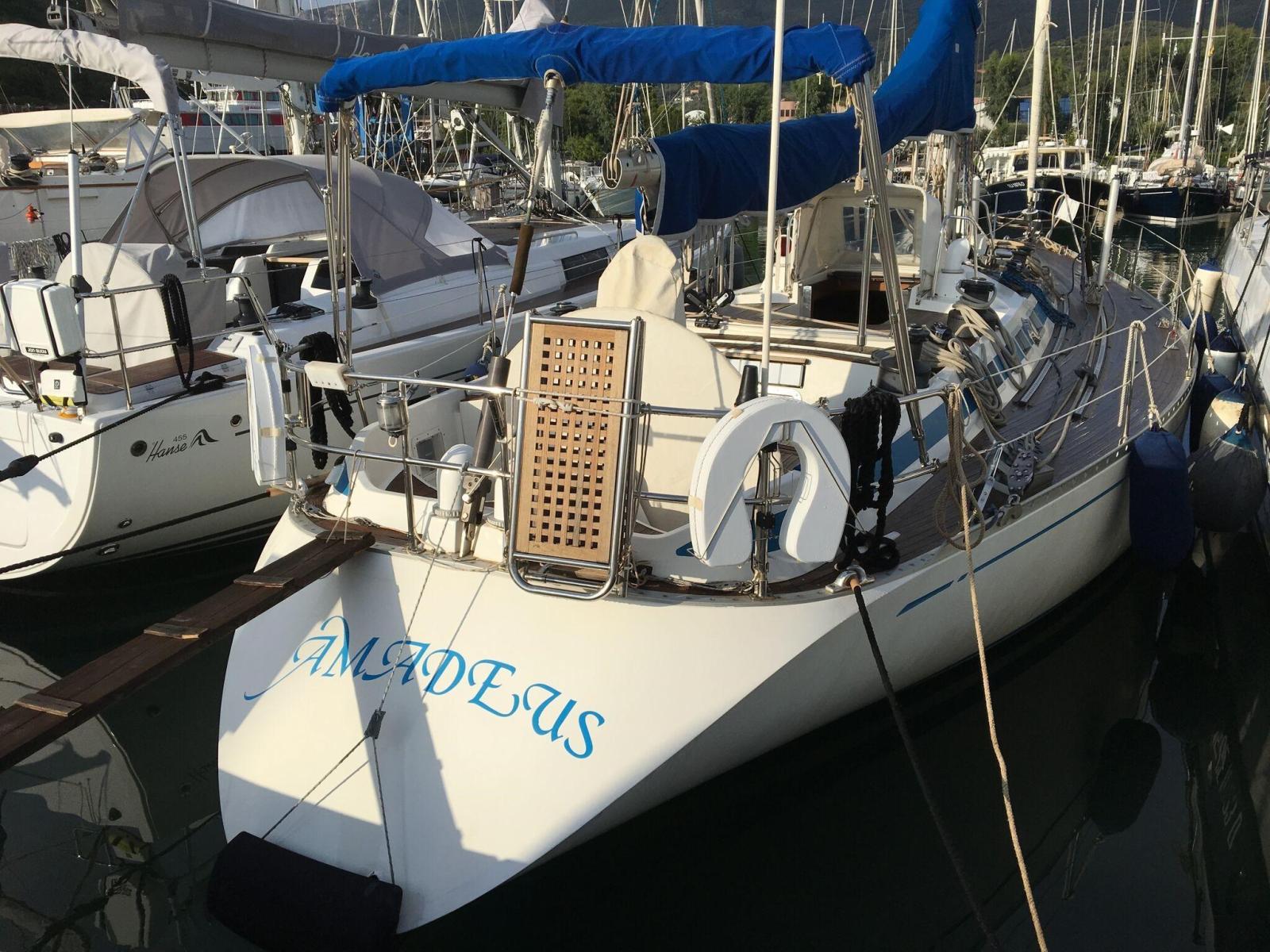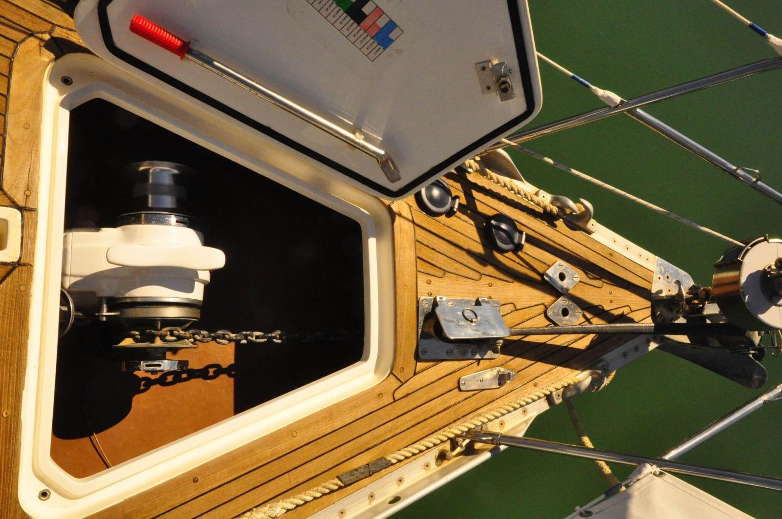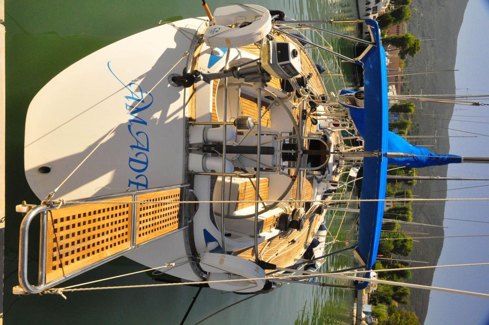 Fini en gel coat blanc avec des rayures bleues. L’antisalissure bleue est appliquée chaque année. Gouvernail Skeg. SeaCocks nouveau 2016.