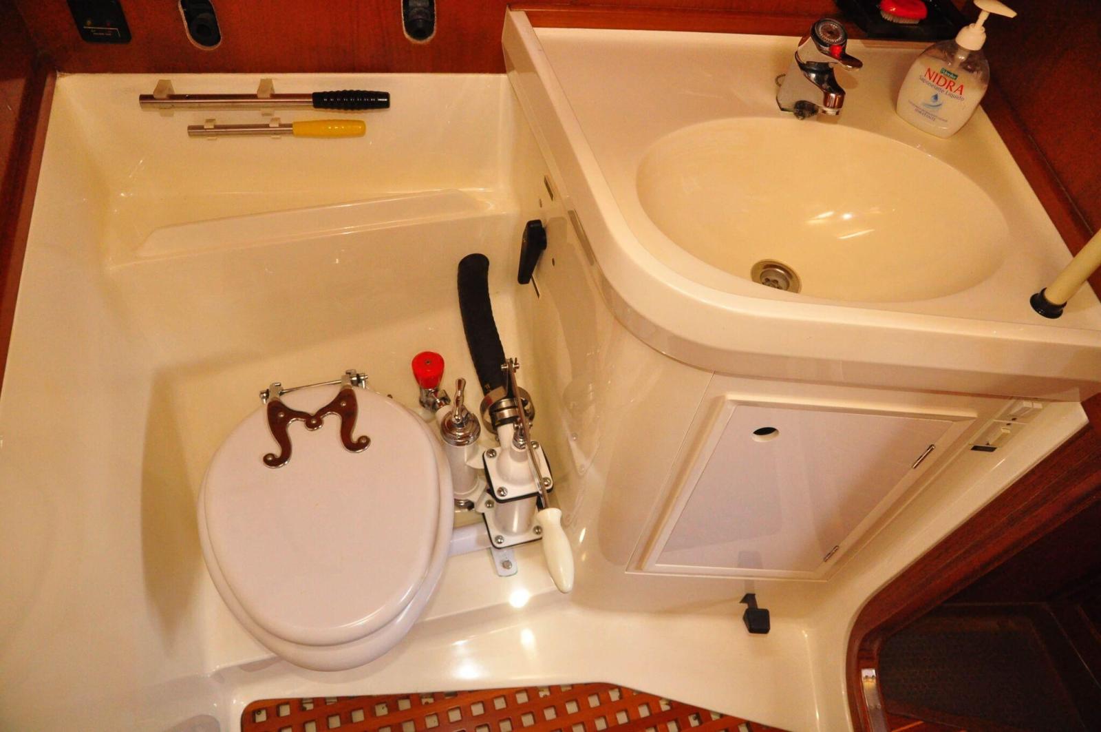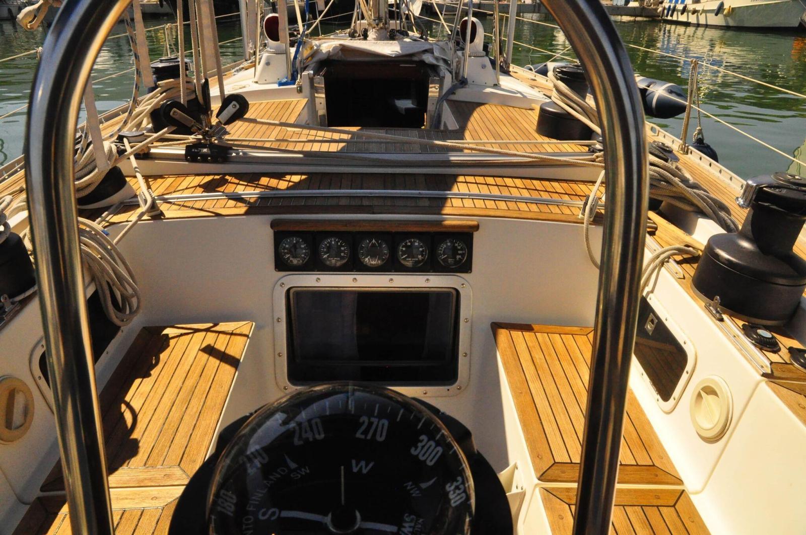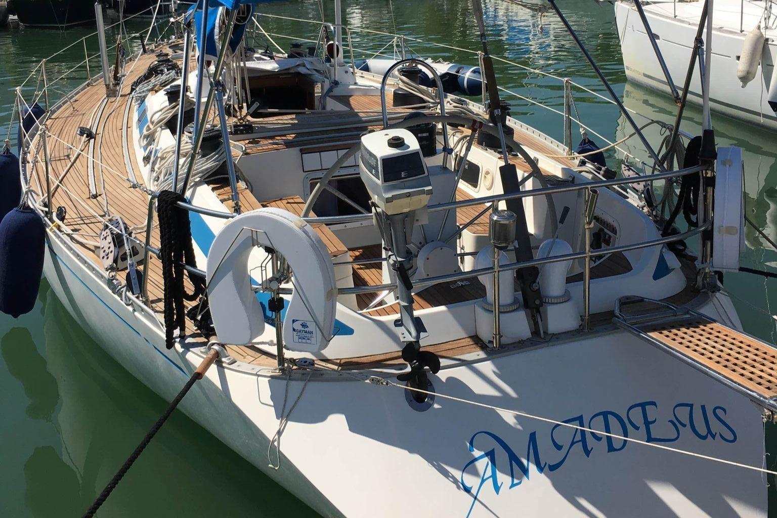 Fini en gel coat blanc avec des rayures bleues. L’antisalissure bleue est appliquée chaque année. Gouvernail Skeg. SeaCocks nouveau 2016.