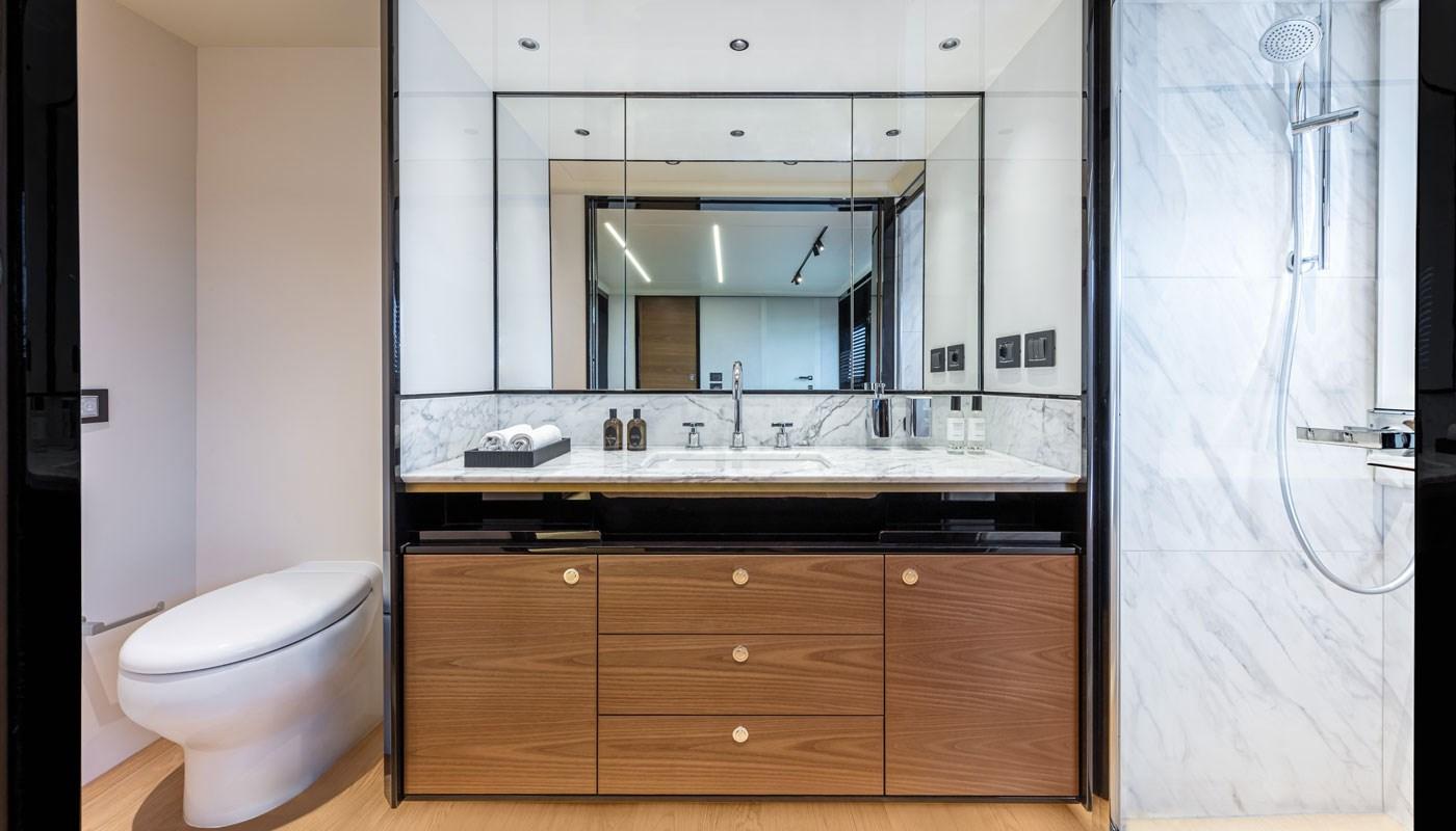 BBQ/ Grill, 2 Coffre-fort (Safes (in bow master cabin and port side VIP cabin)), Air Conditionné (Mediterranean inverter air conditioning (50Hz) for upper and lower deck, equipped with fan coil with selector valve), Connexion à internet (WiFi + 4G data connection), Contrôleur domotique (Fibreglass Hard Top with photovoltaic solar panel system, with energy produced monitoring system integrated into the on-board domotics, with ceiling made of microfiber coated panels and fiberglass colour contrast inserts, with decor dimmable LED lights (1) (it excludes Hard Top without solar panel system)), Gradateur de lumière, Dessalinisateur (Watermaker 260 l/h (69 gal/h) (19Kw+19Kw ca. generators required) with control and command interface in GPS display), Plancher intérieur en bois (in natural woven oak, instead of the carpet floor - Extra price), Prises interieures 12v, Prises interieures 220v, 2 Chauffage (Water heaters (two), one of them dedicated to the bow master cabin), Réservoir d'eau noire, Caméra vidéo (Garmin Surround View system with n.6 cameras along the perimeter of the boat and n.2 cameras in the engine room (it excludes the options: cameras in the cockpit and engine room, mooring camera with display in third mooring station and Garmin Surround View system with display in third mooring station) (), 5 Toilettes électriques.