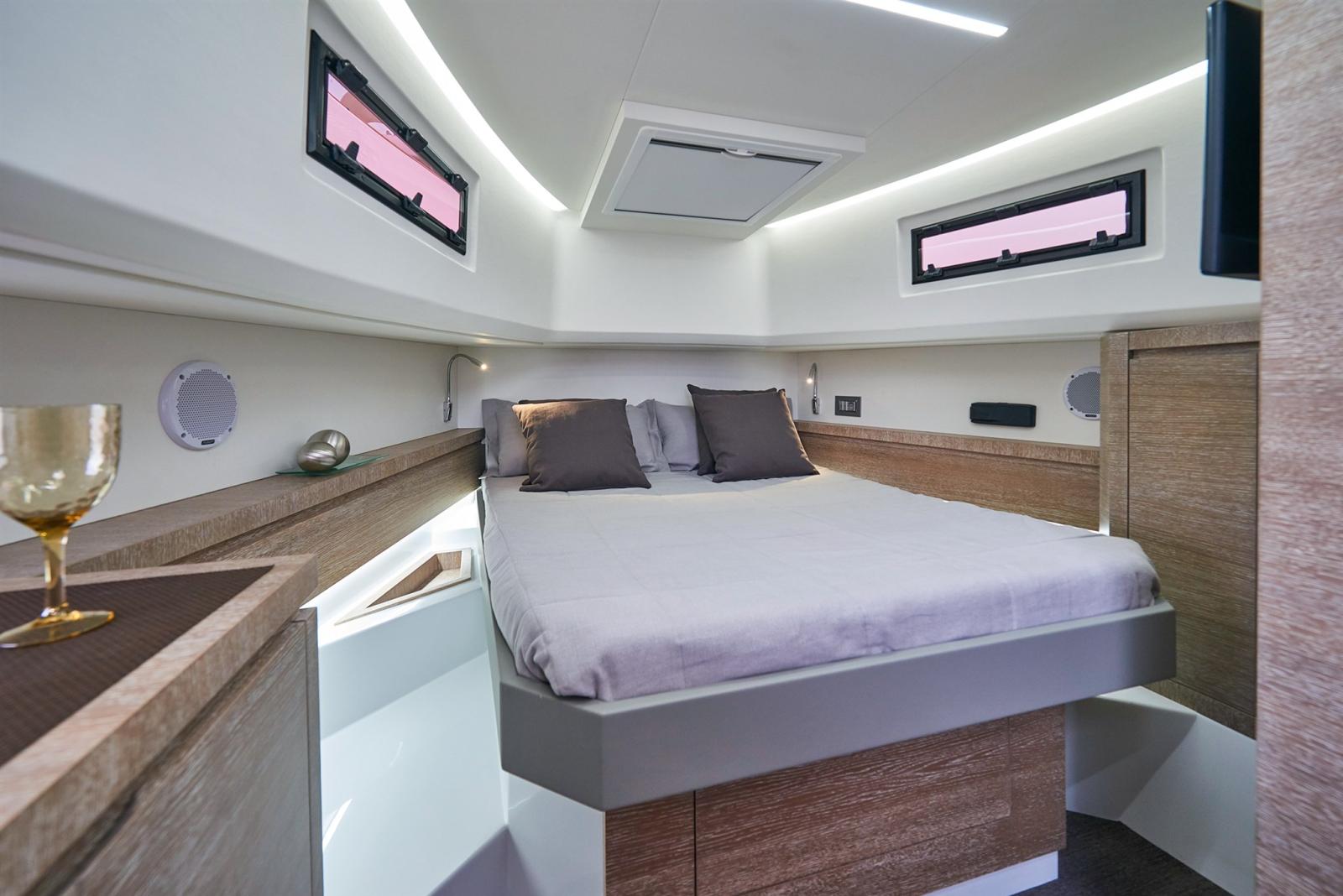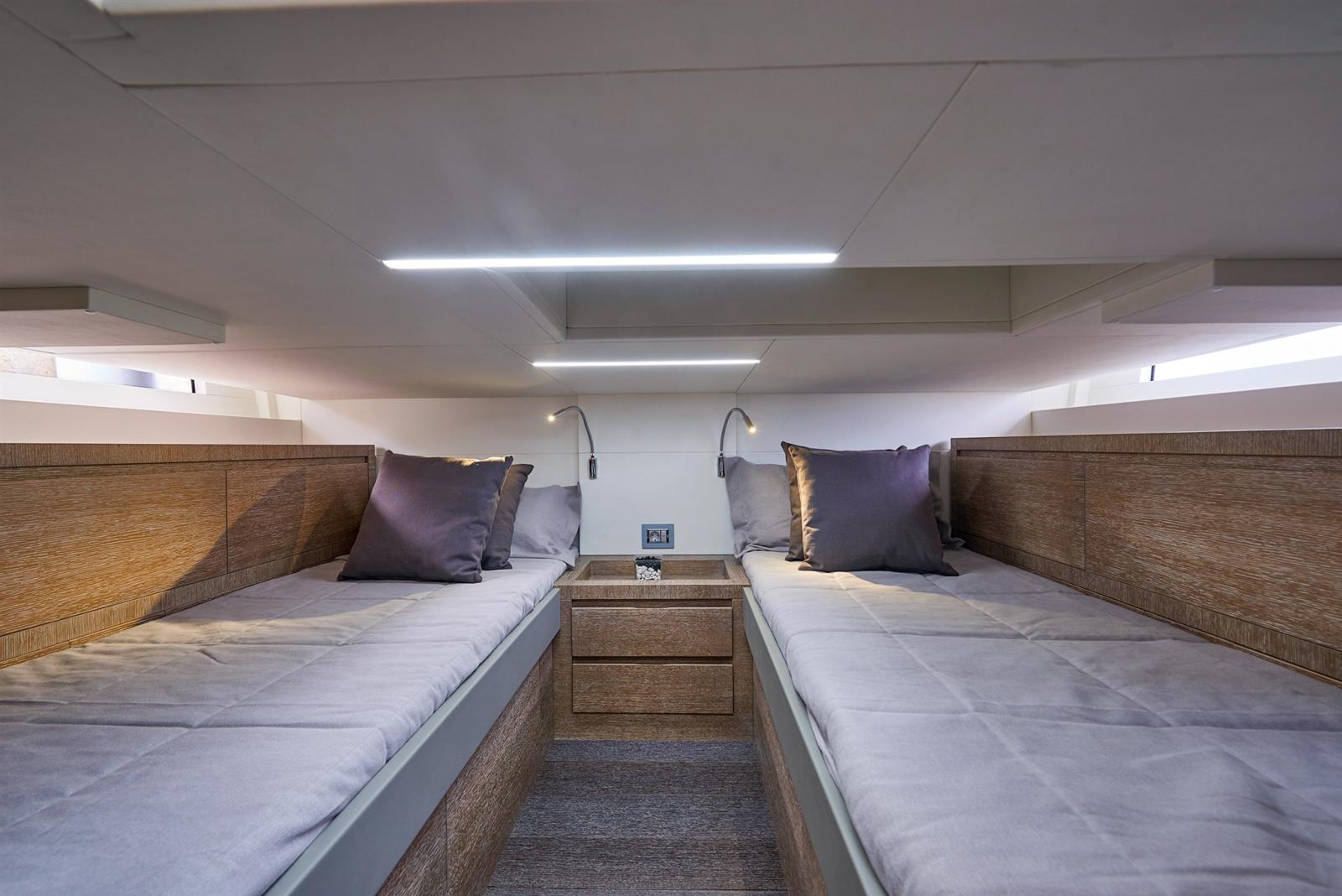Cabine propriétaire avec lit, armoire et tiroirs - Salon avant avec canapé et table avec caisson manuel - Cabine arrière pour rangement