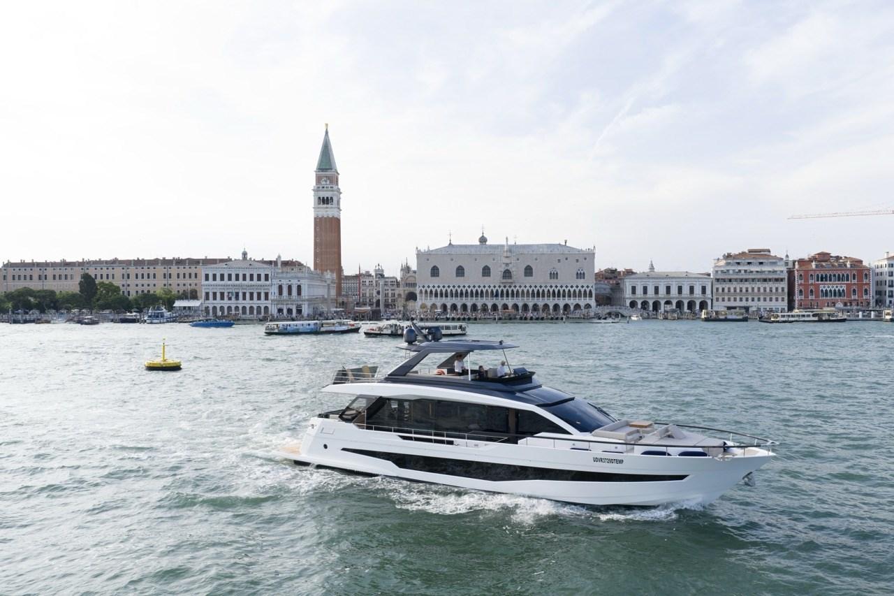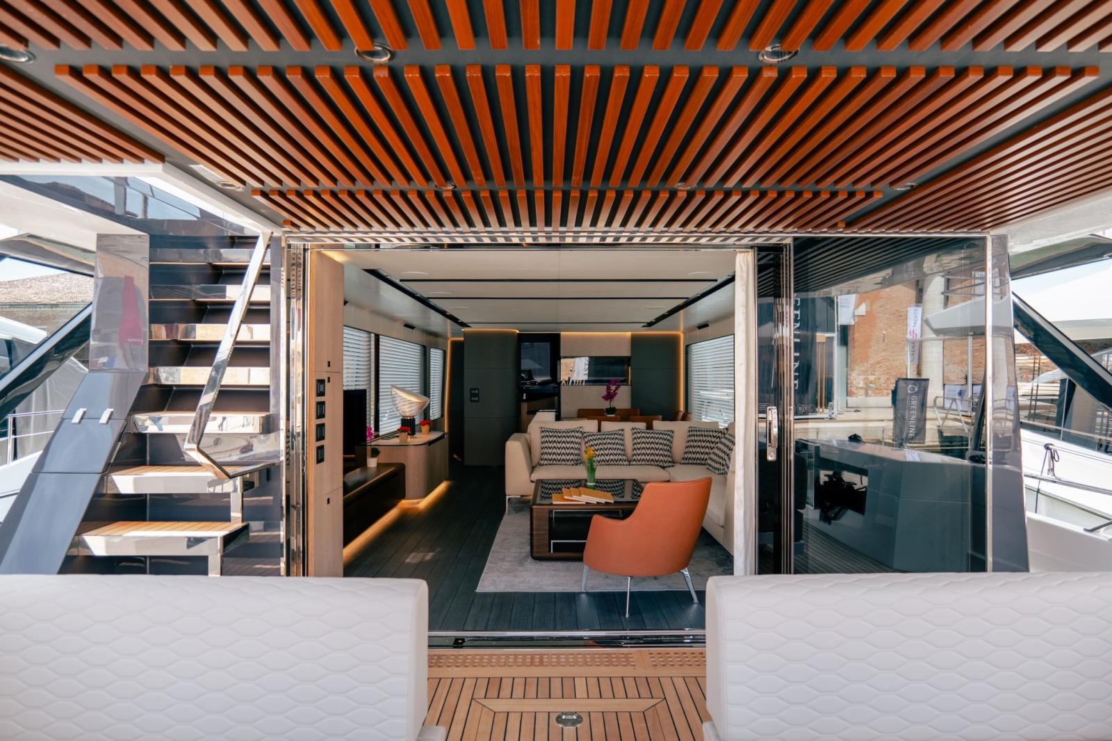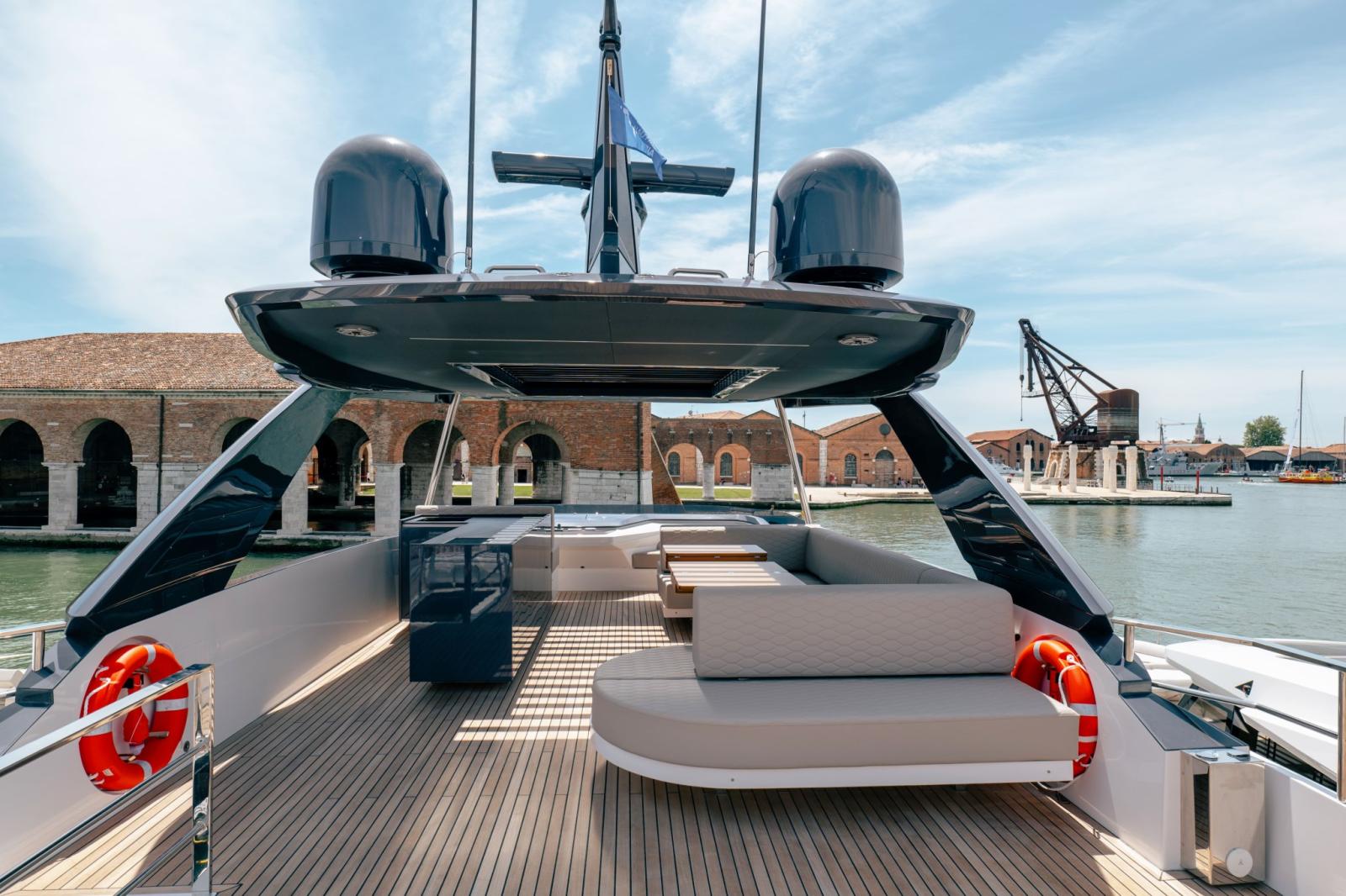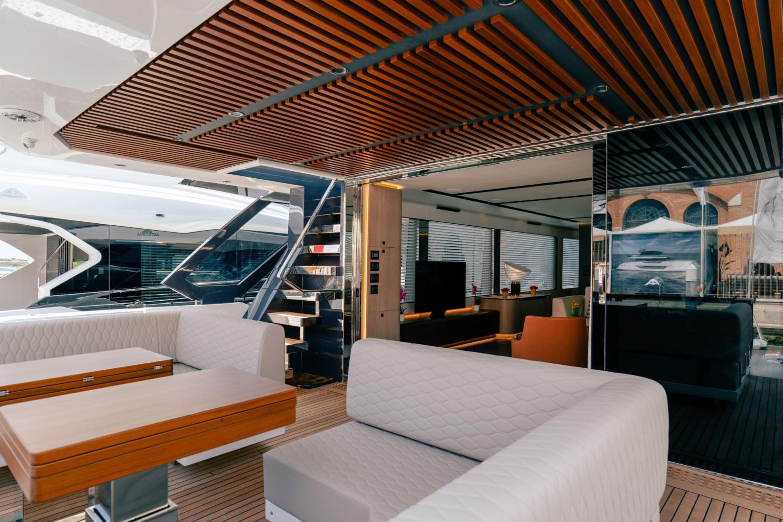 Lumières sous-marines (4) • Toit rigide avec panneaux à ouverture électrique, haut-parleurs et éclairage LED • Teck complet • Mobile Fly avec barbecue, évier et réfrigérateur • Extérieurs et housses de coussins de table • Tables cockpit et bow avec mouvement électrique.