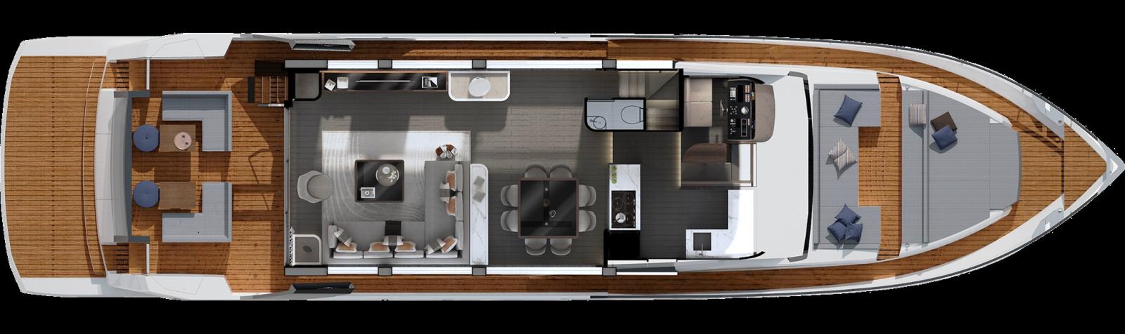 Quatre cabines, quatre salles de bains sous le pont et cabine d’équipage • Saloon, cuisine, salle à manger, salle de bain et poste de pilotage sur le pont principal • Décoration Standard De Luxe • Plancher intérieur en bois du pont • Sol de cabine moquetté • Appareils ménagers : réfrigérateur, lave-vaisselle, four/micro-ondes et plaque à induction • Toilettes Tecma • Auvents manuels sur le pont et le sous-pont