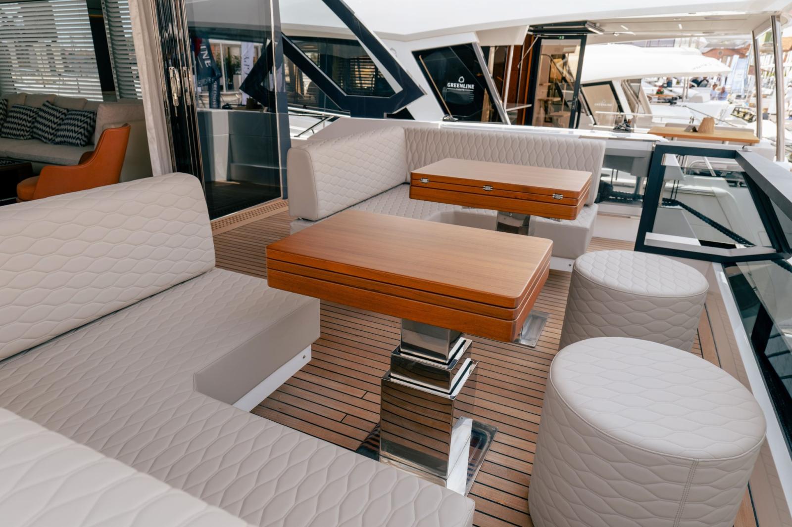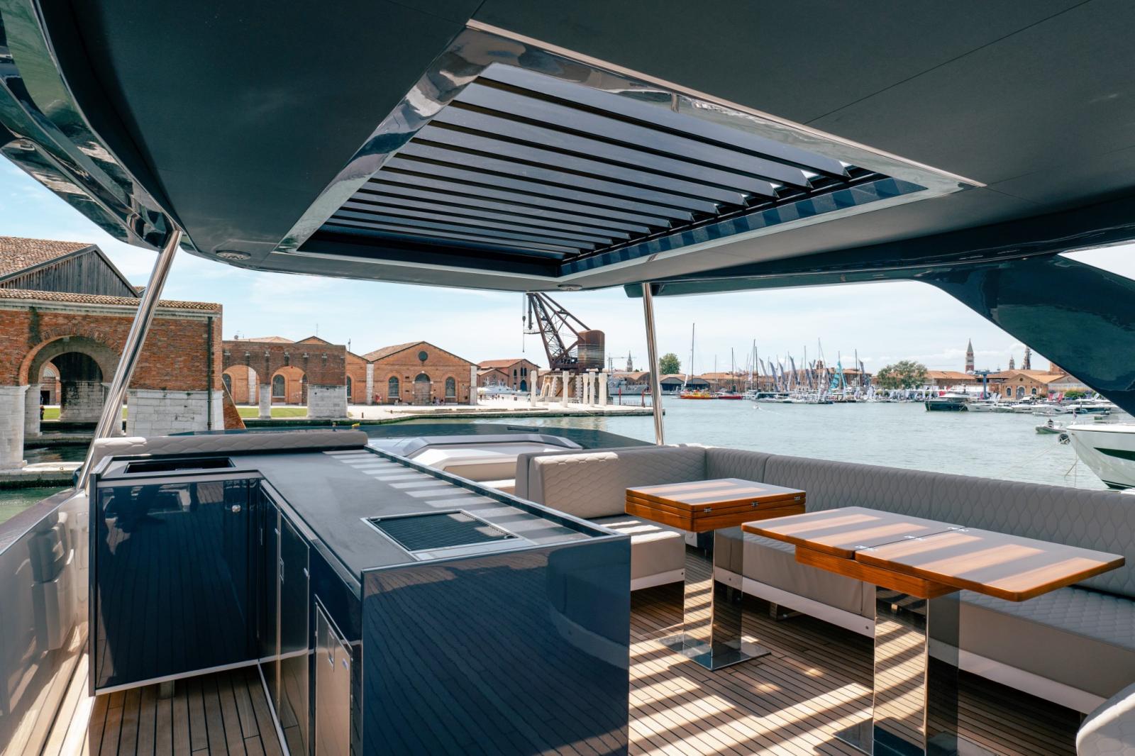 Lumières sous-marines (4) - Toit rigide avec panneaux d’ouverture électrique, haut-parleurs et éclairage LED - Meuble volant avec barbecue, évier et réfrigérateur - Coussin extérieur et housses de table - Tables de cockpit et de proue à mouvement électrique.