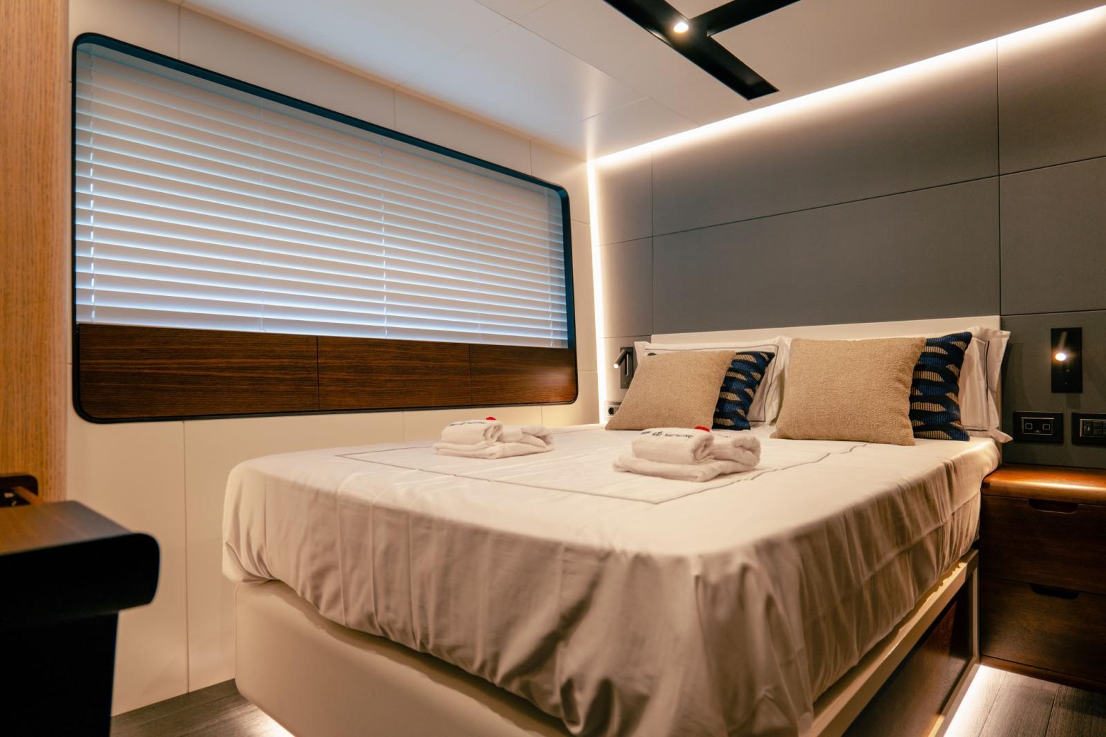Quatre cabines, quatre salles de bain sous le pont et cabine de l’équipage - Salon, cuisine, salle à manger, salle de bain et poste de pilotage sur le pont principal - Décoration Standard De Luxe - Plancher intérieur du pont en bois - Moquette des cabines sous le pont - Appareils électroménagers : réfrigérateur, lave-vaisselle, four/micro-ondes et plaque à induction - Toilettes Tecma - Tentes à commande manuelle sur le pont et sous le pont