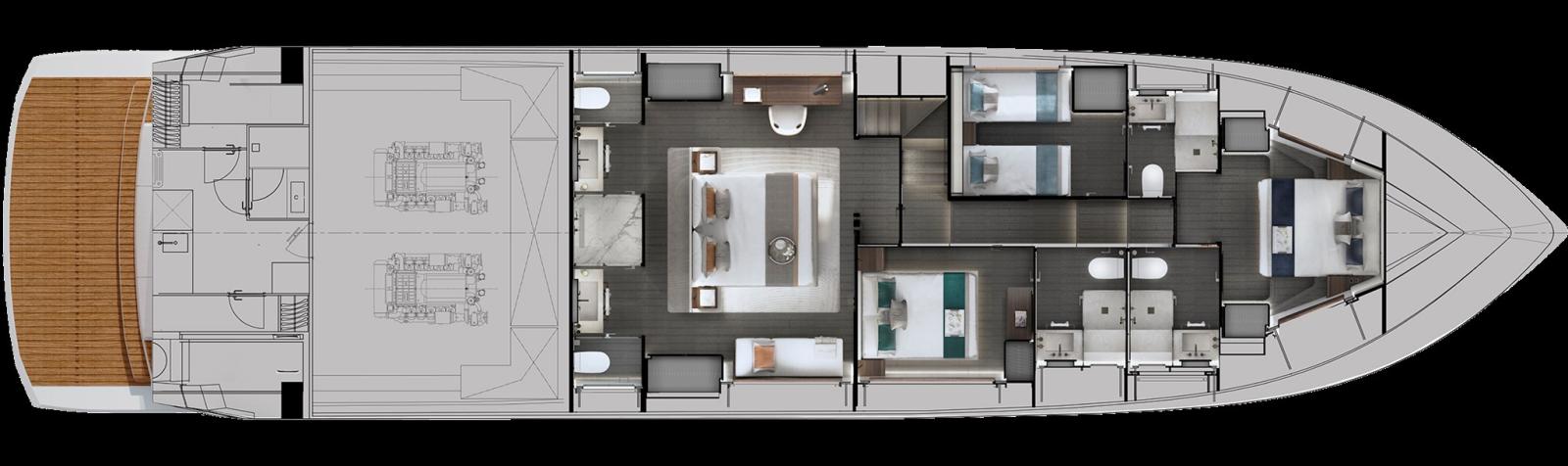 Système audio Yamaha flybridge et proue - Système audio Yamaha sous le pont - TV 32 » dans la cabine VIP et la cabine invité tribord - TV 24 » dans la cabine invité bâbord et celle de l’équipage.
