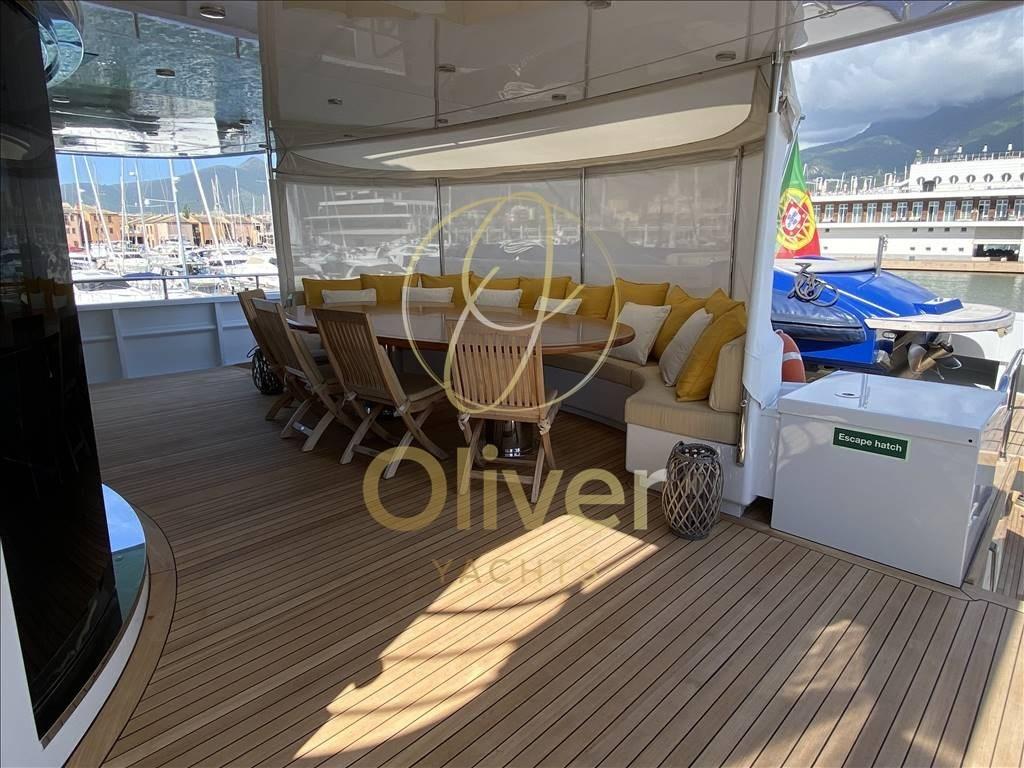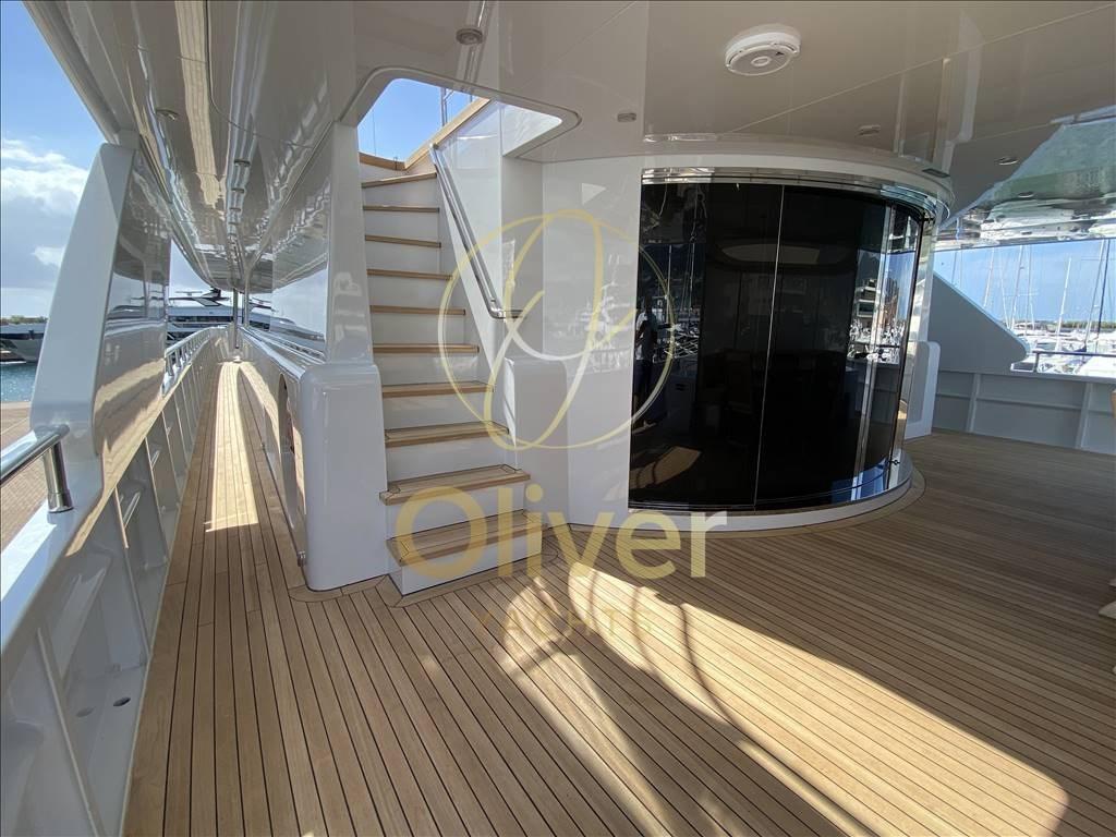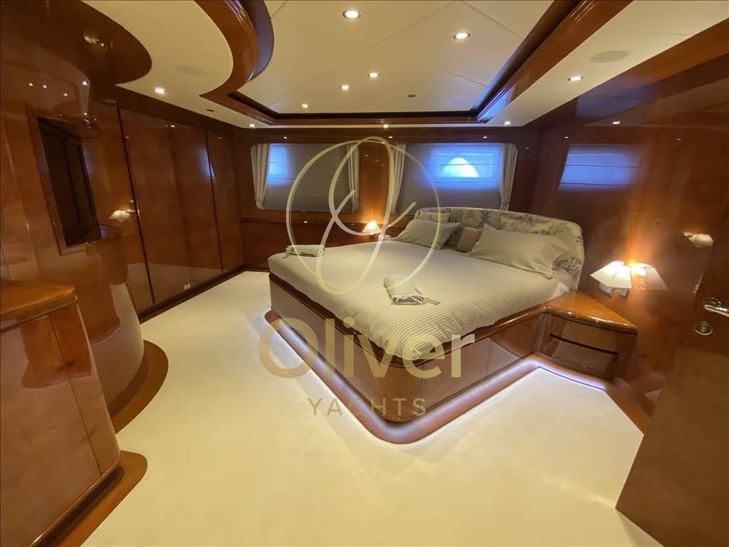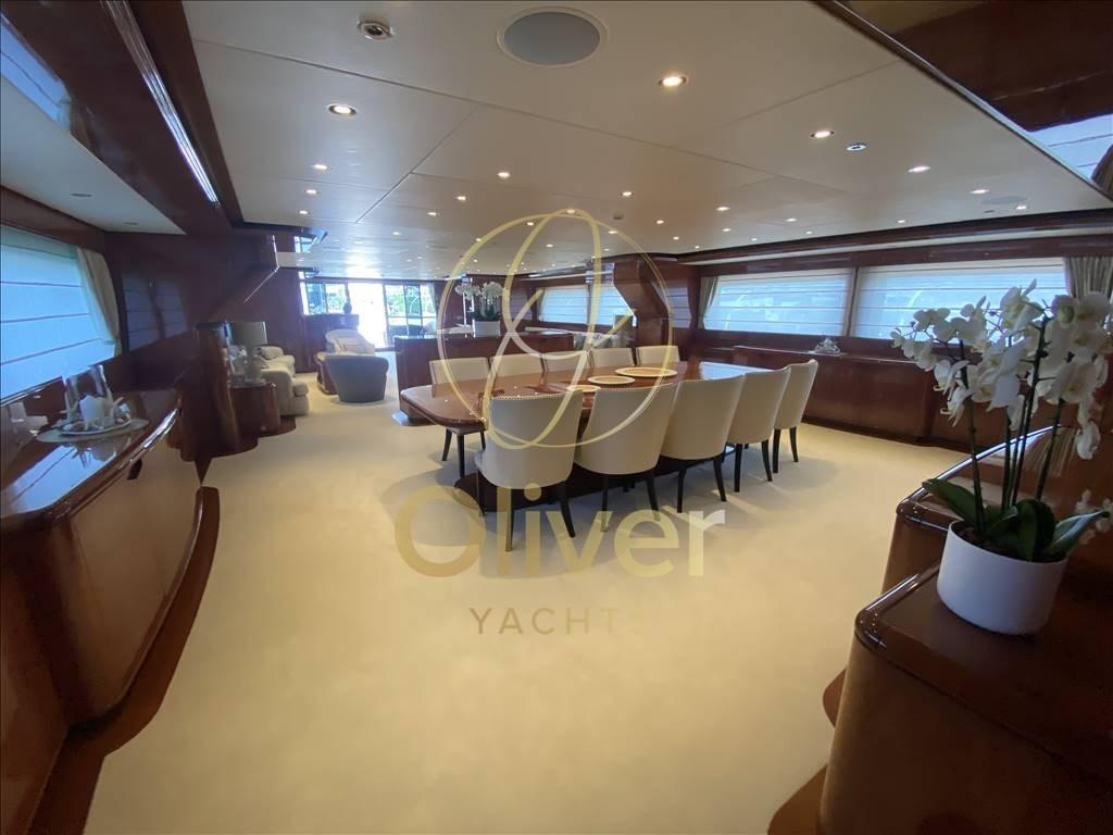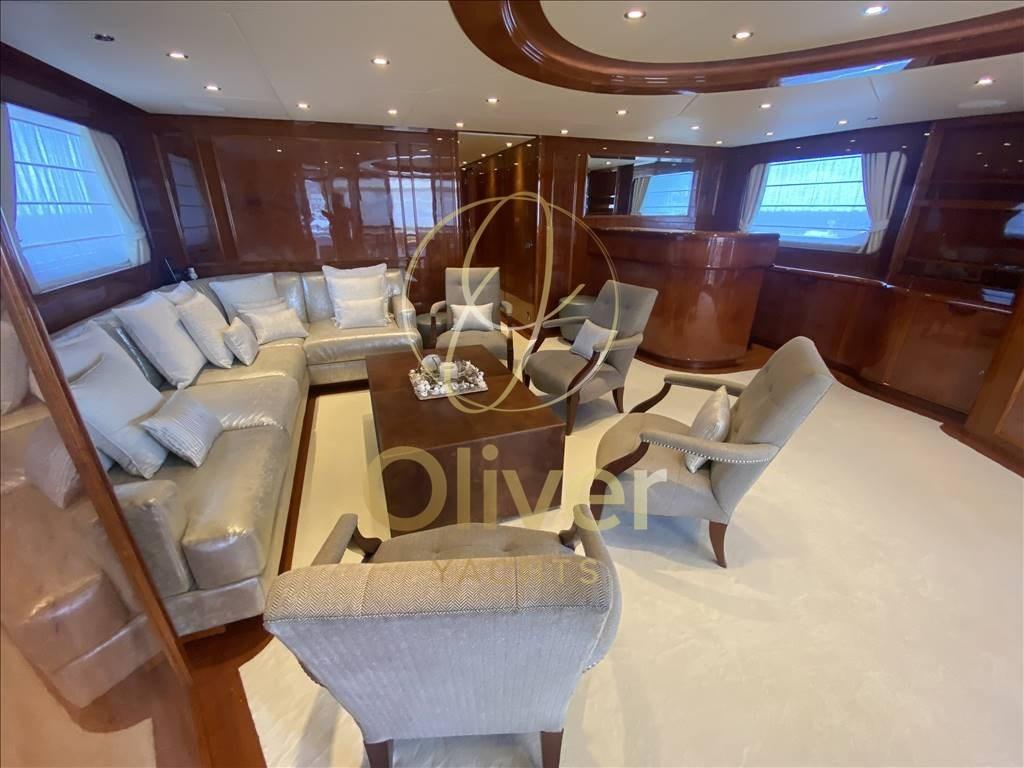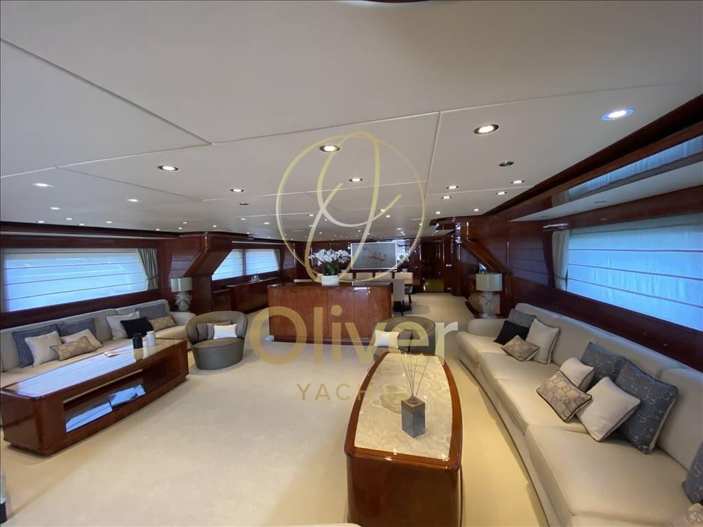 Depuis le pont principal, vous pouvez accéder au grand salon, situé sur le côté tribord se trouve le bar avec comptoir. Vers la proue se trouve le grand salon sur toute la largeur composé de deux grands canapés avec une table basse et quatre fauteuils pour créer deux espaces de réunion différents. Séparé par un buffet avec un meuble TV escamotable se trouve la salle à manger avec une grande table pour 12 personnes. Vers la proue, sur le côté bâbord, se trouve le couloir d’où partent les escaliers menant aux ponts inférieur et supérieur, ainsi que l’accès à la cuisine et à la cabine du propriétaire. Cette dernière est séparée de l’entrée par un bureau pour permettre une plus grande intimité. La chambre pleine largeur est très spacieuse et équipée d’une salle de bain avec toilettes, bidet, double vasque, douche et baignoire à remous.