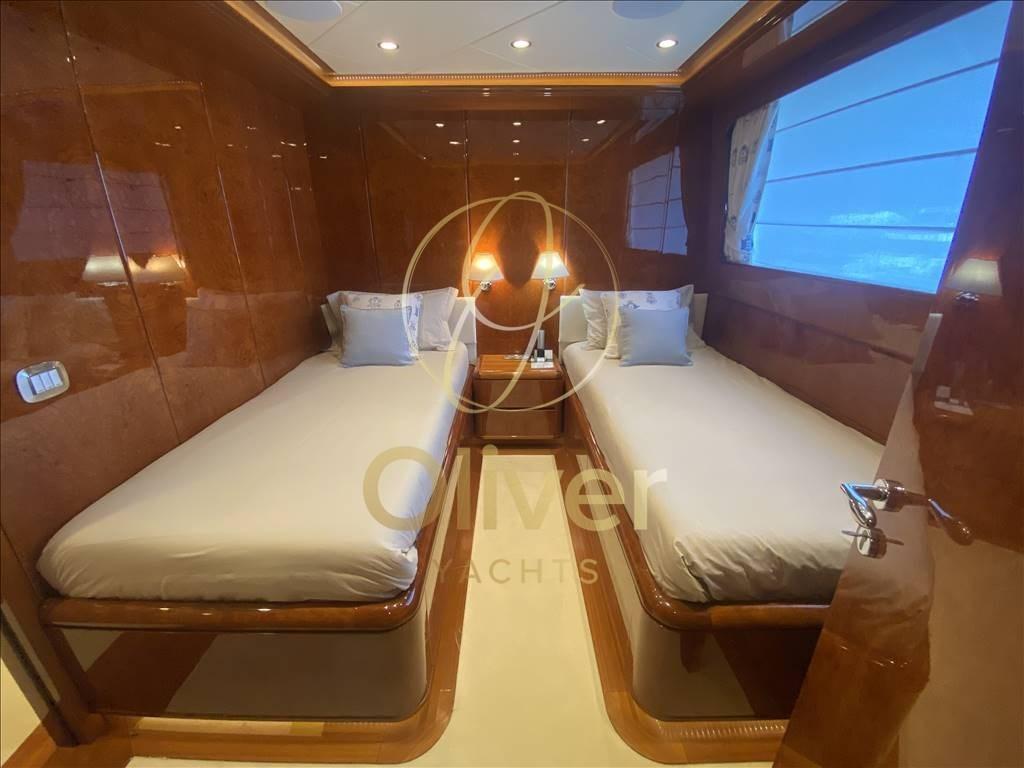 Sur le pont inférieur, il y a la cabine VIP avec un lit diagonal et également avec une salle de bain avec toilettes, bidet, double lavabo, douche et baignoire à remous. Vers la proue, à bâbord, se trouve la cabine double avec salle de bain attenante équipée de toilettes, bidet, double lavabo, douche et baignoire à remous, tandis que plus loin sur le côté tribord se trouve la cabine double avec lits plats équipée d’une salle de bain avec toilettes, bidet, lavabo et douche.