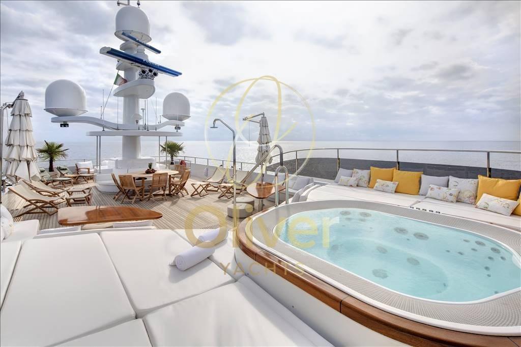 Un yacht à trois ponts avec de grands ponts extérieurs arrière et un grand bain de soleil équipé d’un grand espace pour bronzer, d’un grand jacuzzi, d’une douche et d’un bar. Le yacht dispose de deux salles à manger, une intérieure sur le pont principal et une extérieure sur le pont arrière, le salon principal sur le pont principal et un sky lounge sur la passerelle.