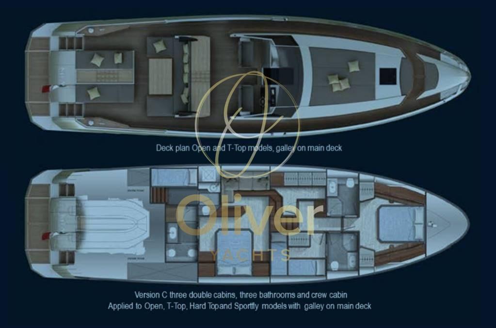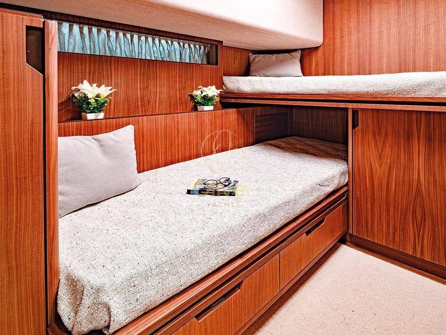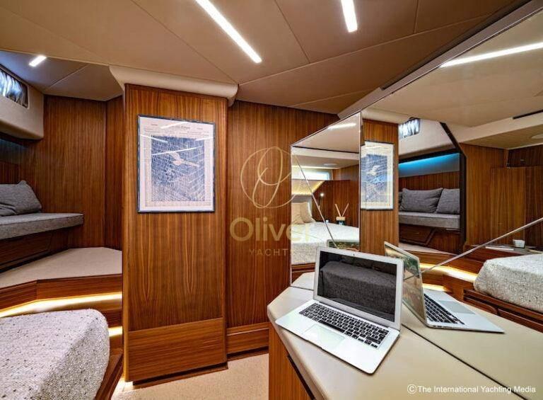 Les aménagements intérieurs, conçus par l’architecte Marco Veglia, sont en grande partie modulables : il y a trois cabines en plus de la cabine de l’équipage avec salle de bain et entrée indépendante depuis le pont. La surface totale sous le pont est de 55 mètres carrés de surface au sol. La cuisine sur le pont vous permet de dédier tout le pont inférieur, ou sous le pont, avec sa salle à manger, pour la nuit.