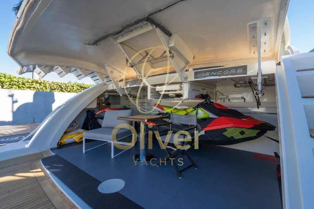 Pont principal arrière : Ponts complets en teck avec grande terrasse arrière avec rangement en dessous, Deux bains de soleil, Om, Canvas Orelli, Banquette orientée vers l’avant sur le pont arrière Table en teck poli avec quatre chaises, dans la télévision pop-up de droite, Buffet en étoile avec étagère en onyx, Garde-corps surdimensionné en acier inoxydable avec concierge et marches arrière tribord, Caméras de pont arrière, marches de tableau arrière en teck pour garage et plate-forme de bain, douche arrière, échelle de bain électrique, passerelles centrales de tableau arrière Sert également de pont roulant pour l’entretien du garage arrière avec sortie d’eau douce et d’air comprimé
