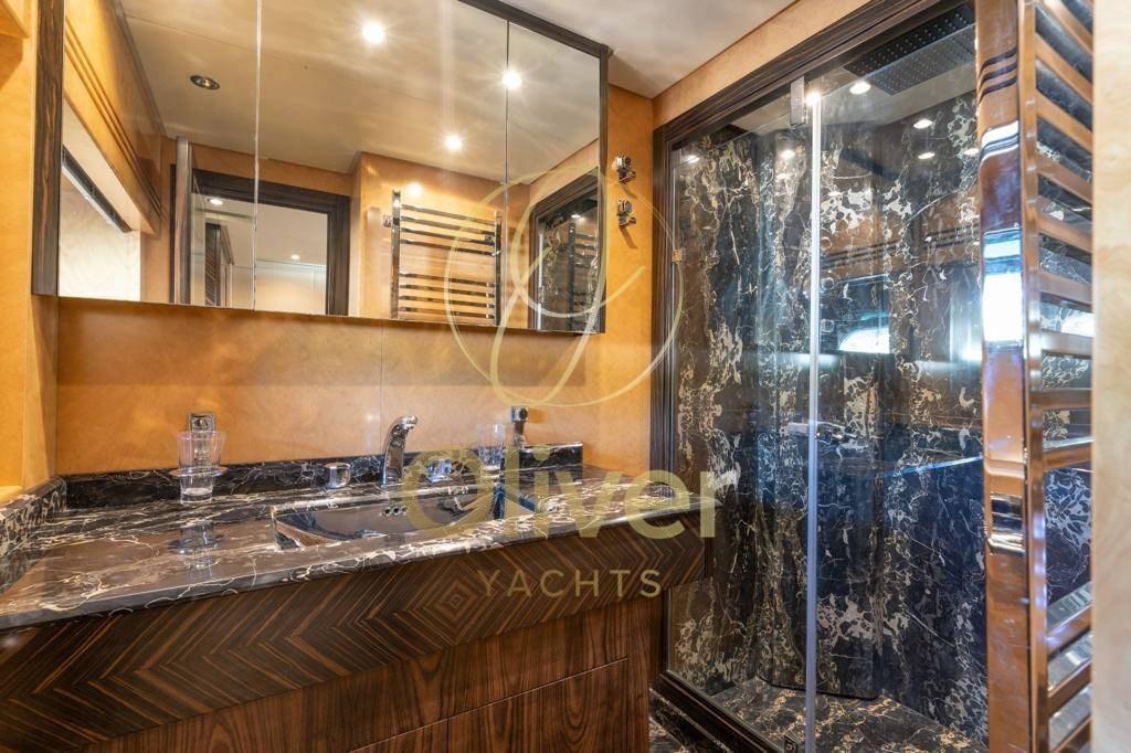 Cabine VIP avant : lit double, moquette, grand téléviseur Sony, haut-parleurs surround supérieurs, (2) grandes armoires latérales à la porte et à tribord, porte de secours d’urgence suspendue à la tête VIP, salle de bain avec sols en marbre et dessus en marbre avec lavabo et miroir intégré en acier inoxydable, WC et bidet Tecma, compartiment de douche latéral à la porte