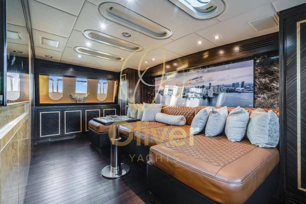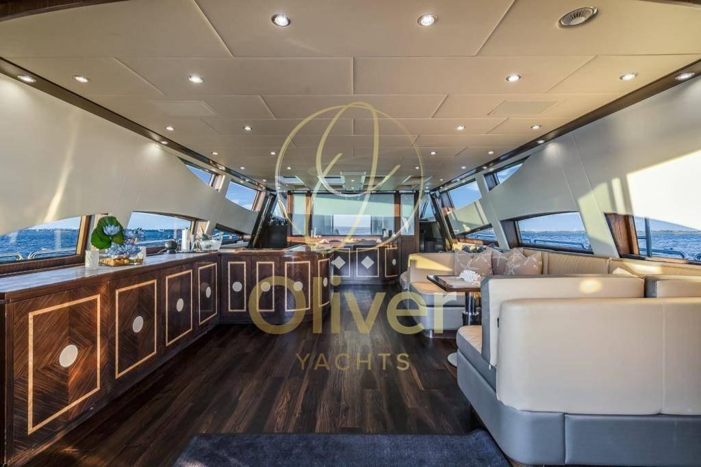 Salon : Planchers en bois, TV Samsung avec ascenseur, Grand canapé lounge tribord avec table et base en acier inoxydable, Nombreux rangements pour le salon bâbord, Bar avec plan de travail en onyx avec 2 réfrigérateurs sous comptoir, Machine à glaçons Frigomar et évier, Plafonniers, TV LG à l’avant avec ascenseur, Sous comptoir pour la vaisselle et le café des cops, Systèmes de divertissement, haut-parleurs ambiophonique haut de gamme