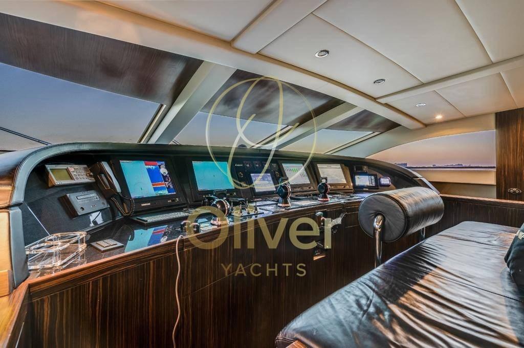 Poste de pilotage et électronique : Banquette en cuir pour le capitaine et les observateurs, Poste de pilotage central avec affichage MTU de la ligne bleue, Télécommande et commandes de gouvernail de secours, Commande du propulseur d’étrave, Contrôle de l’assiette, Essuie-glaces, Moniteur de vidéosurveillance pour les ponts arrière et latéraux, GPS/WAAS GP 32, Sonar multifonction Furuno, Anémomètre Furuno, Traceur graphique Furuno Navnet, Récepteur Furuno Navtex, radar Furuno, traceur Simrad et Nobeltec, VHF GMDSS, TV SATELLITE KVH, portes d’aile électriques bâbord et tribord pour accéder aux ponts