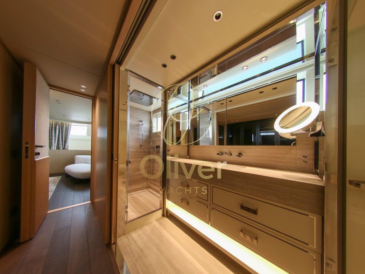 Cabine principale : Un véritable havre d’intimité et de confort, avec un lit king-size, une salle de bain attenante et un dressing.