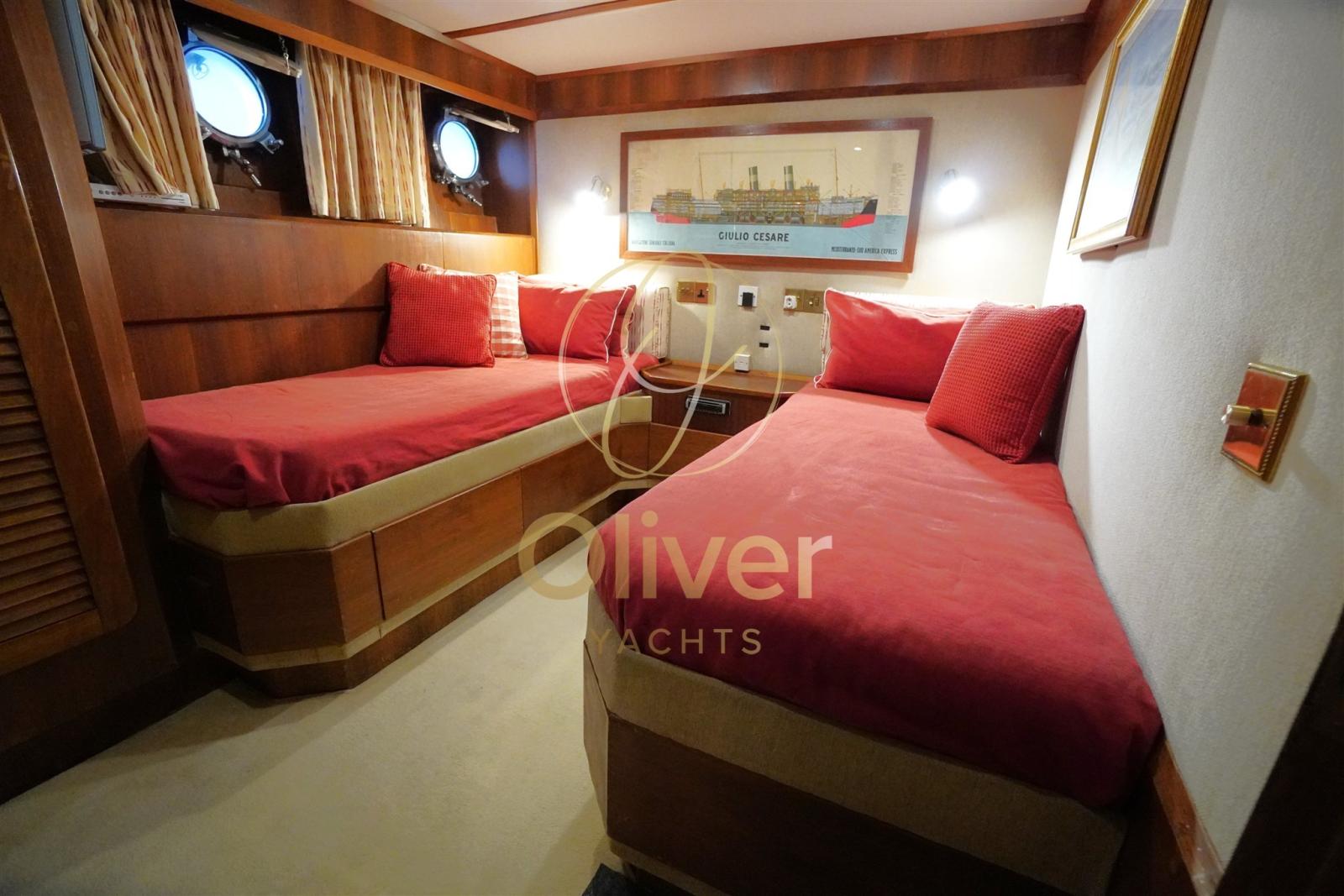 Naviguer en toute confiance : les deux moteurs diesel GADNER vous permettent d’atteindre une vitesse de 14 nœuds, tandis que la navigation à 9 nœuds garantit un voyage agréable et confortable également grâce aux stabilisateurs efficaces. L’autonomie de 5 000 milles nautiques ouvre la porte à des croisières au long cours sans souci. Le récent réaménagement garantit une fiabilité et une sécurité maximales, avec des systèmes de pointe et un équipement complet.
