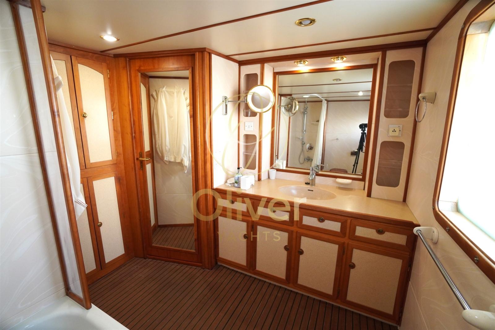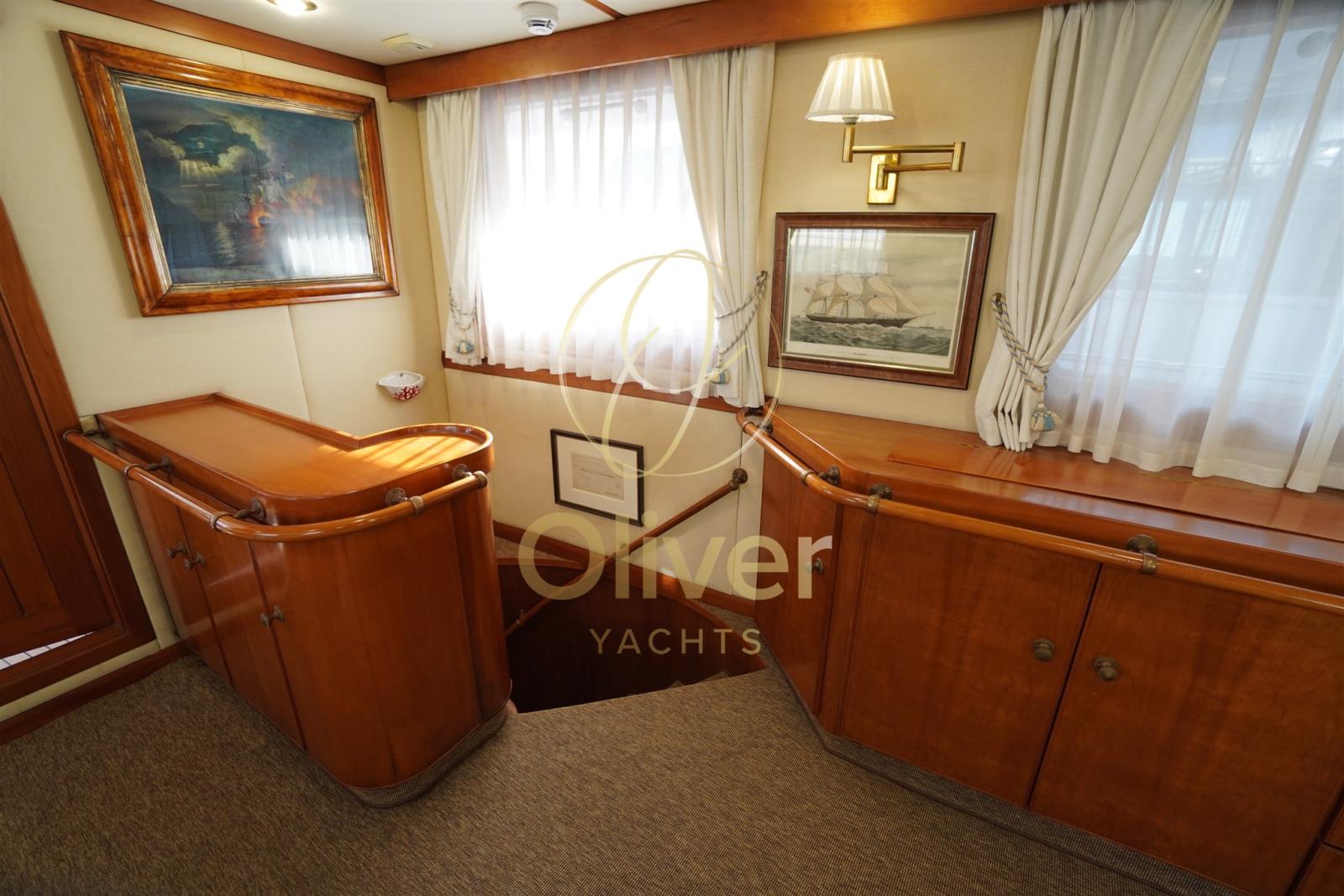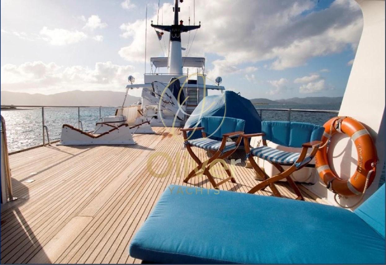 Alarme gaz, Alarme moteur, Alarme de pompe de cale, 2 Ancre, Eau sous pression, Passavant en teck, Douche de cockpit, Phares fixes arrière, Phare de poursuite, Grue de flybridge, Extincteur(s) fixe(s), Lavage de chaine, Éclairage de courtoisie, Passerelle, Pompe de cale automatique, Porte latérale, Porte latérale, Cockpit en teck, Prise de quai, Connexion eau sous pression à quai, Onduleur, Guindeau Hydraulique, Echelle de coupée, Echelle de bain, Selles pour Annexe, Système de filtration des eaux usées, Stabilisateurs, table de cockpit, Table pliante de salon, Filières avec sortie latèrale, Corne, Pont en teck, Winch électrique arrière.